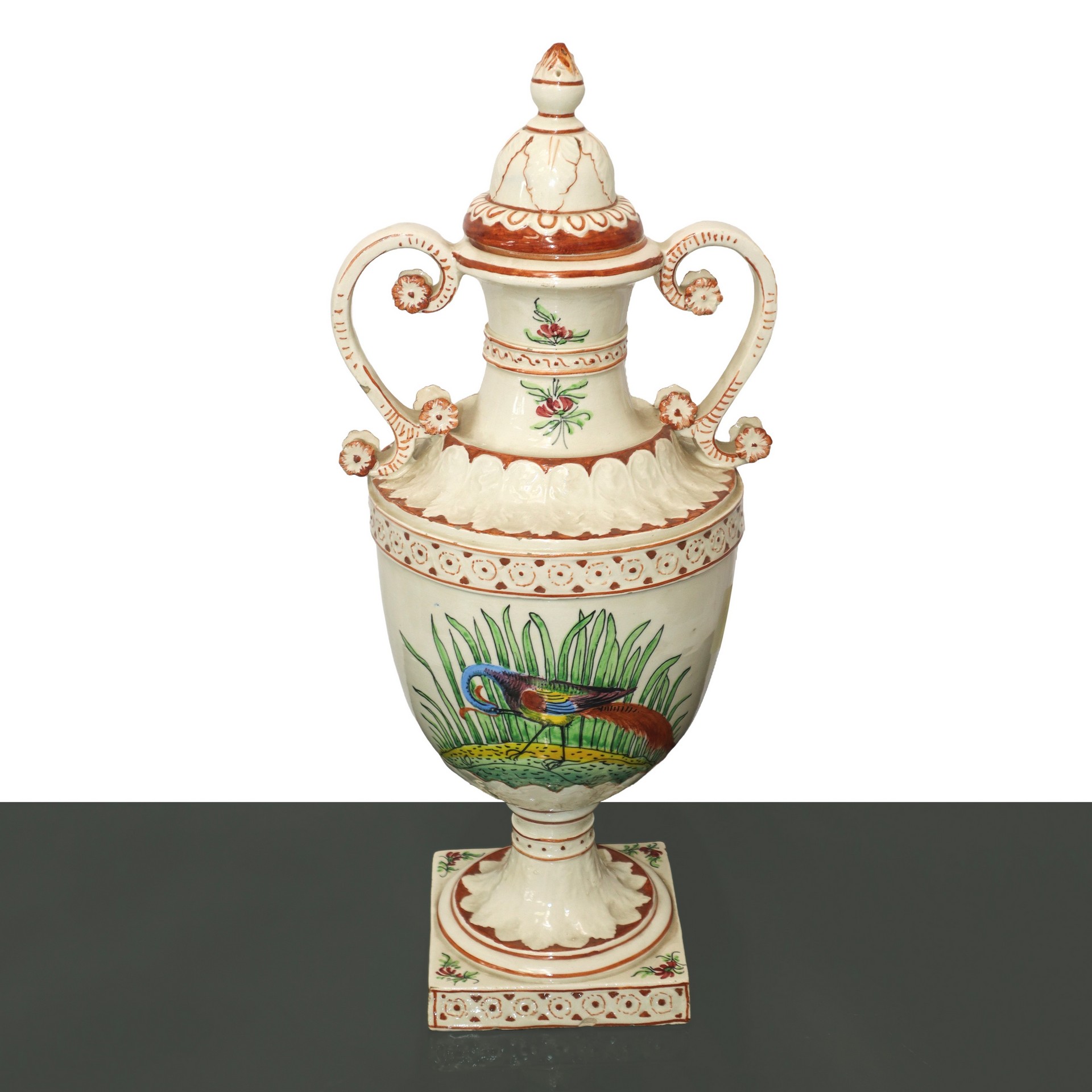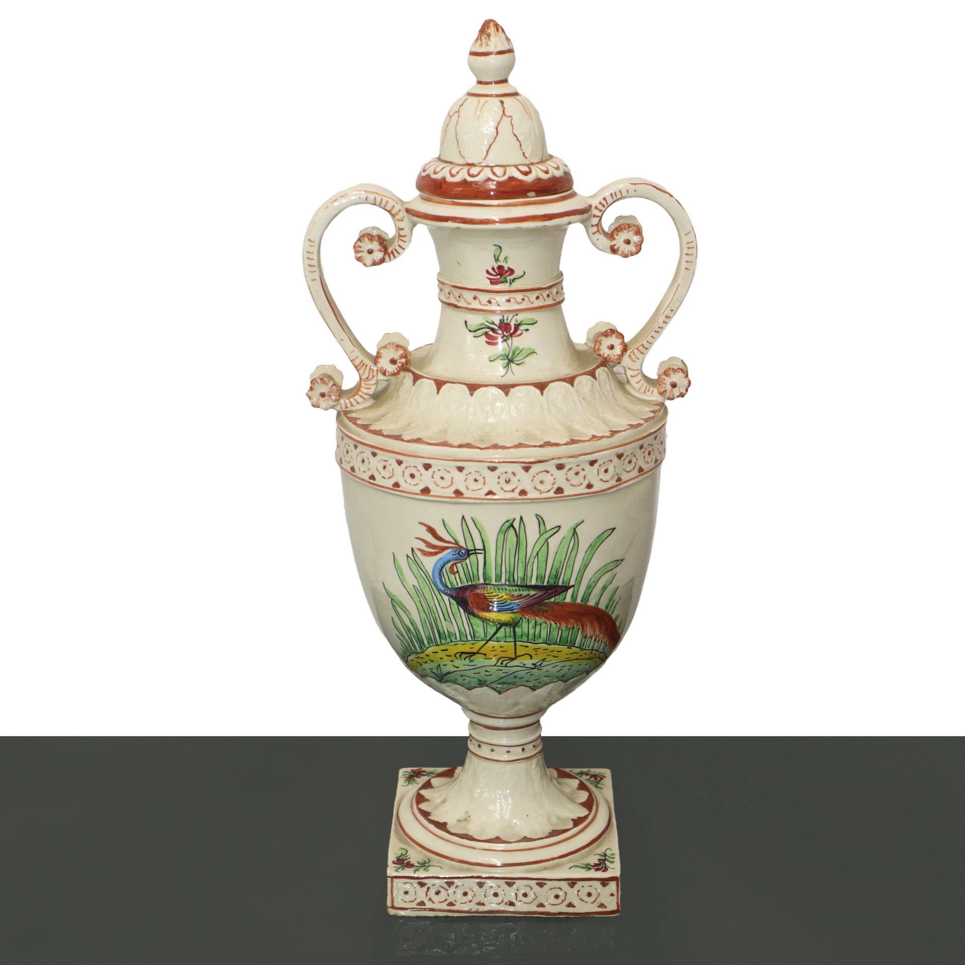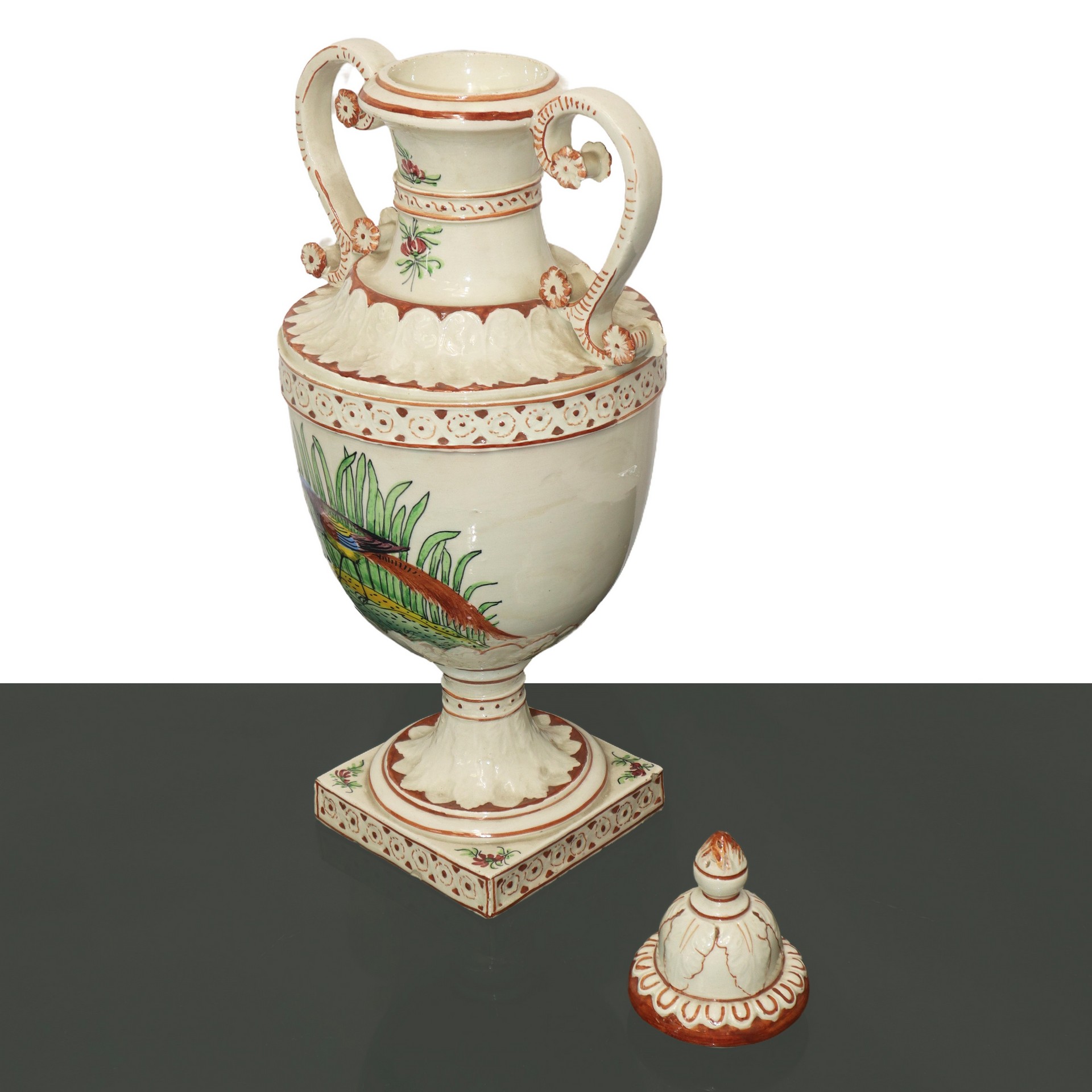 Potiche in ceramica veneta decorata a motivi settecenteschi e dipinta con Uccello del paradiso su ambo i lati, Nove di Bassano, fine 19° secolo