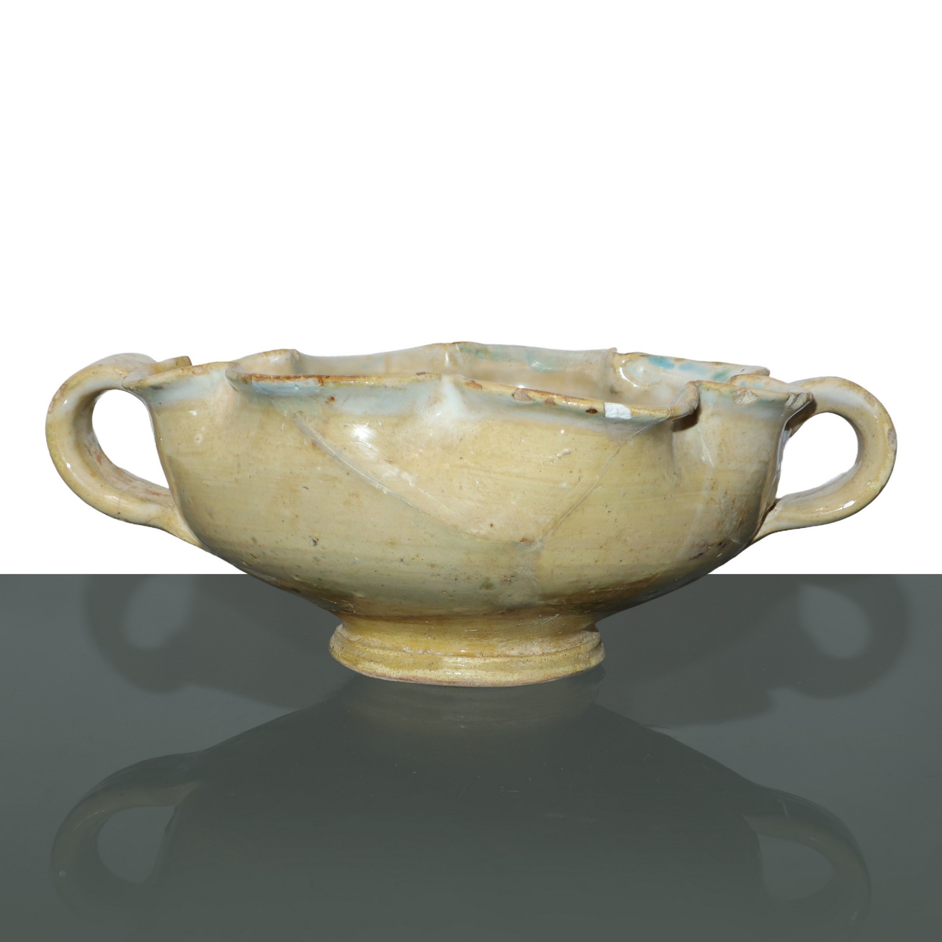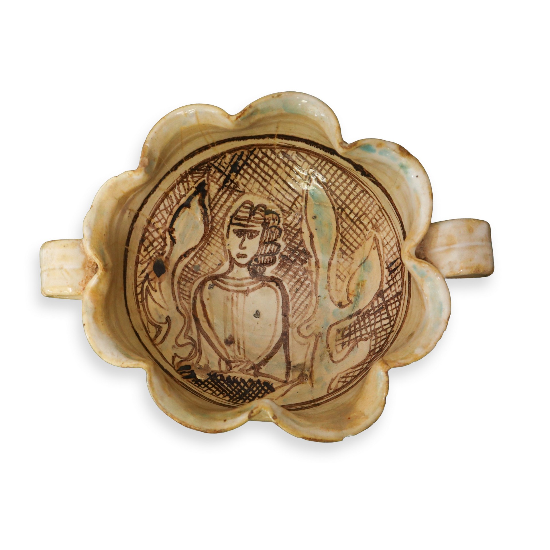 Coppa biansata e ondulata con figura femminile, Central Italy, 14° secolo H cm 8x22 decorazione con figura femminile entro reticolo e foglie. decorazione con figura femminile entro reticolo e foglie.