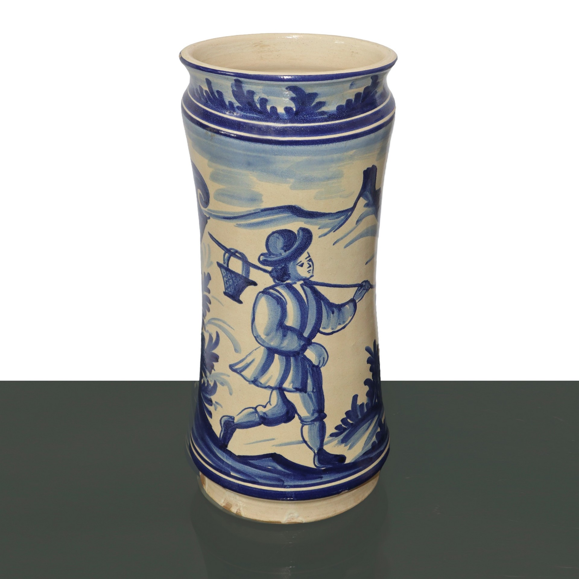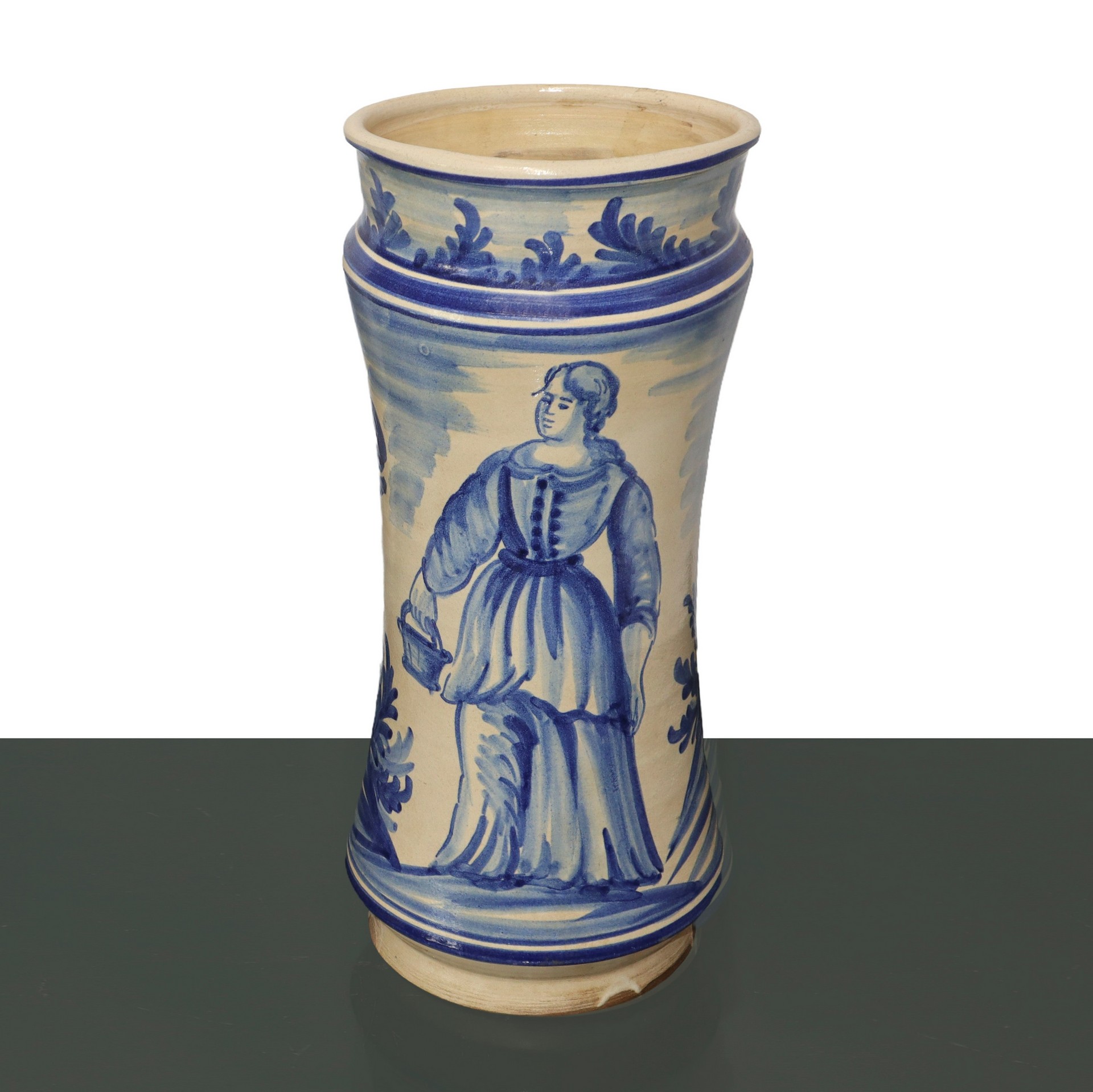 Coppia di albarelli da farmacia in maiolica dipinta,, Spain, primi 1900s Dipinta con personaggi ed iscrizione del farmaco in diagonale.Dipinta con personaggi ed iscrizione del farmaco in diagonale.
