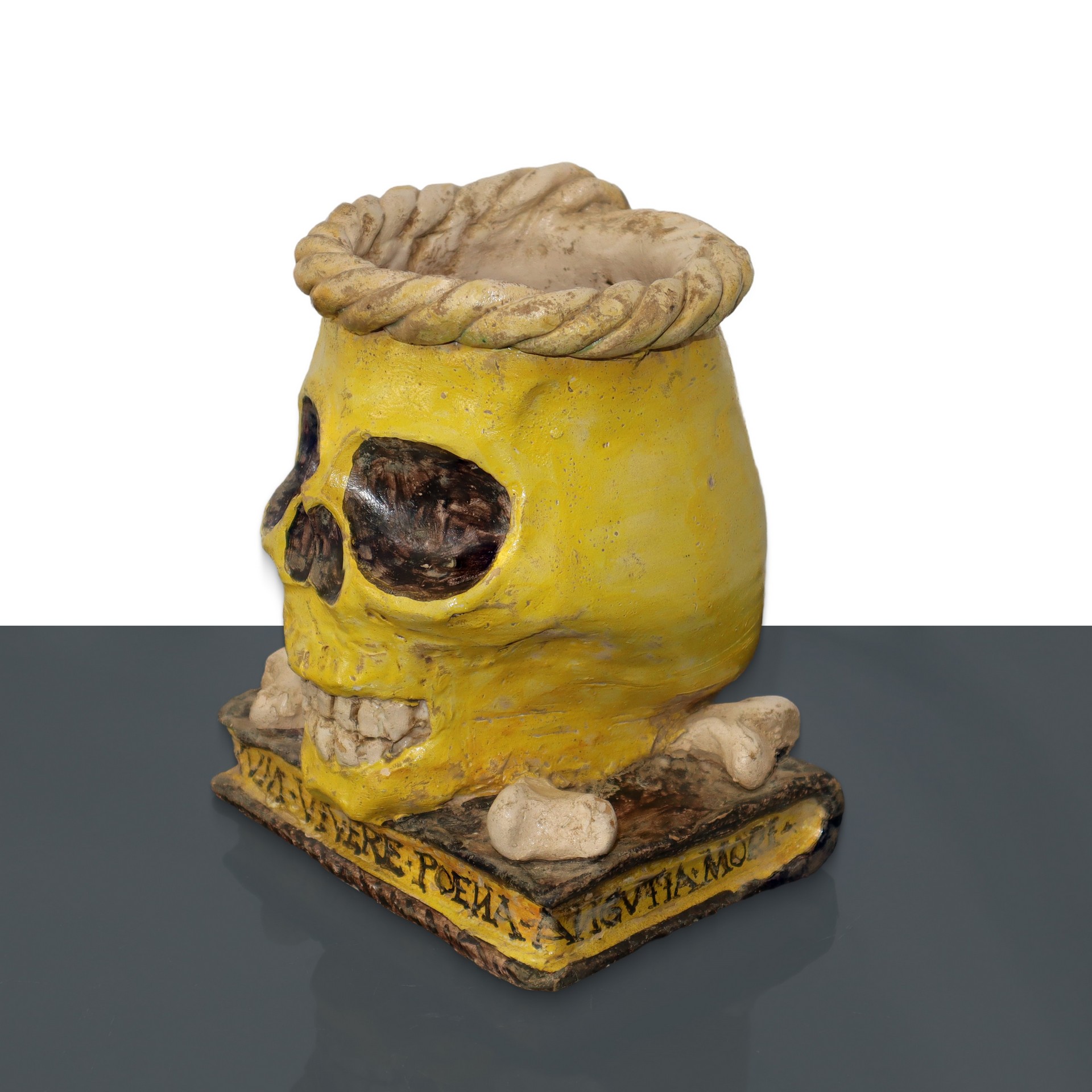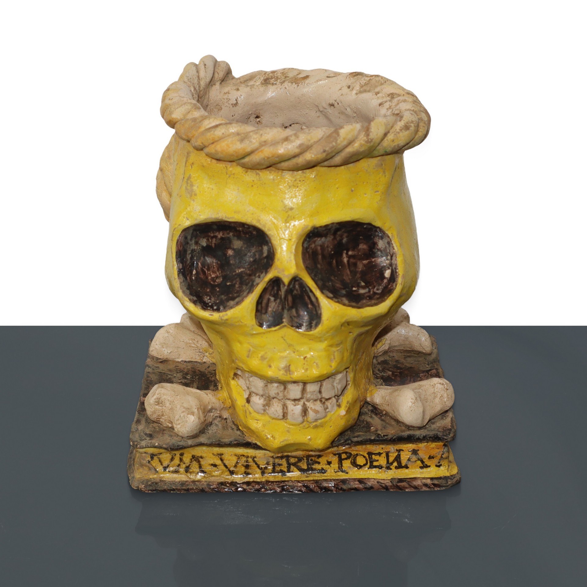 Vaso Vanitas in maiolica di Caltagirone, primi 19° secolo H cm 29 x 18 Con motto iscritto "Nasci miserum vivere poena angustia more" ovvero "Nascere è una sofferenza ,un dolore vivere, un problema morire”.Con motto iscritto "Nasci miserum vivere poena angustia more" ovvero "Nascere è una sofferenza ,un dolore vivere, un problema morire”.