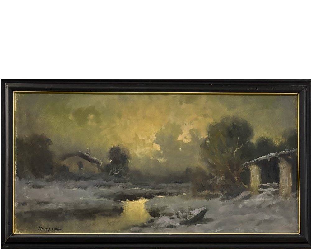 Ivan Karpoff Novocerkassk 1898 - Milano 1970, Tramonto sulla neve Olio su tela cm 40x80 firmato in basso a sx