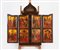Iconografo russo del XIX secolo Iconostasi portatile raffigurante Madonna con i Santi e le Dodici Feste tempera all'uovo su tavola cm 55x118 - icona centrale cm 55x29 - le sei cm 37x14,5 ognuna Al verso etichette di garanzia e provenienza