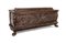 Cassone rinascimentale in noce, XVI secolo cm 70x172x54 coperchio ad urna con profilo dentellato, pannello frontale delimitato da mascheroni angolari, centrato da scudo circondato da fitta decorazione in bassorilievo a raffigurare girali con foglie e grappoli; cornice inferiore convessa percorsa da scaglie, piedi anteriori ferini. Difetti e restauri