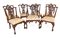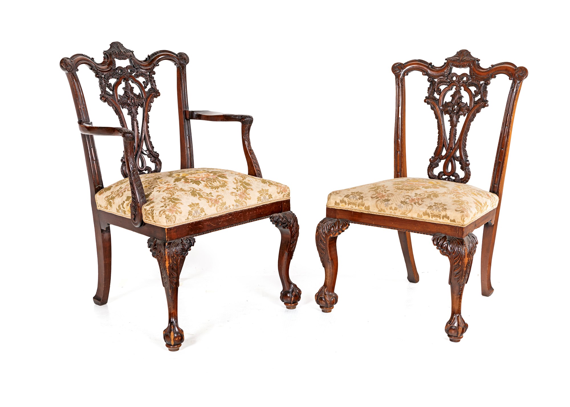 Sei sedie ed una poltrona in mogano, Inghilterra, XIX secolo cm 98x60x52 e cm 101x63x55 rispettivamente schienali a giorno di gusto Chippendale, sedili imbottiti, gambe anteriori lievemente sagomate terminanti ad artiglio su sfera