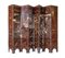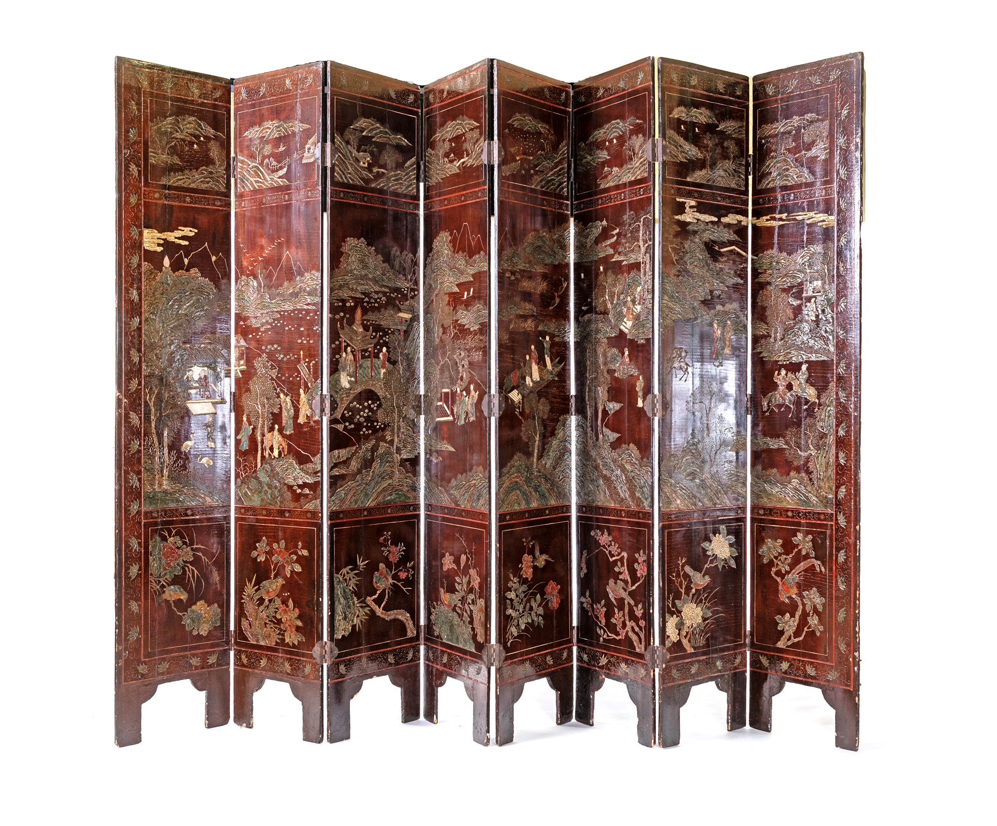 Paravento a otto ante in legno e lacca di Coromandel, Cina, XVIII secolo cm 214x40,5 ogni anta decorato su entrambe i lati da paesaggi animati da personaggi e composizioni floreali intagliati e laccati in policromia su fondo rosso scuro; cerniere in bronzo brunito