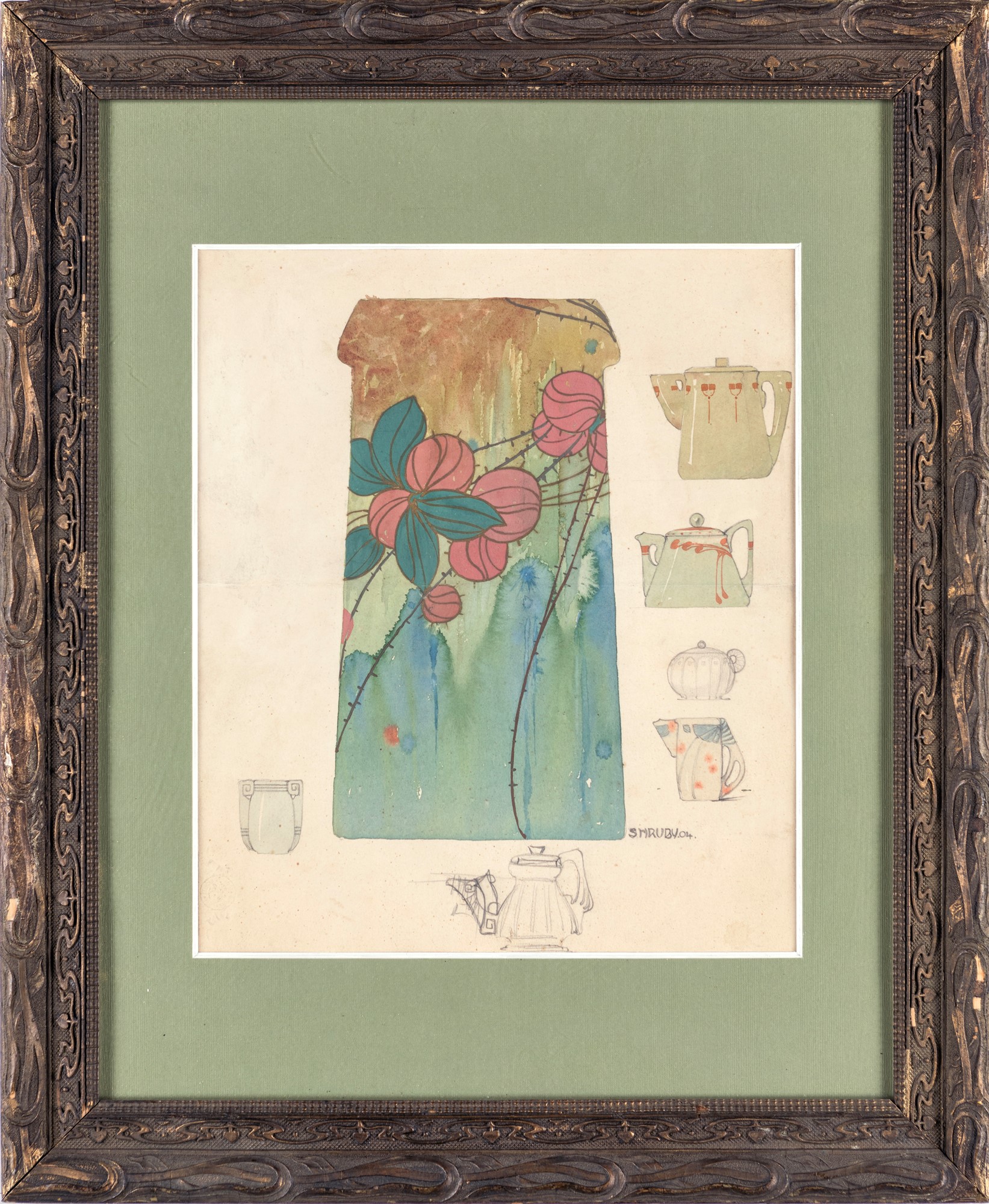 Progetto di vetrata e caffettiere 1904 Acquarello, oro e matita su carta mm 350x290 - in cornice cm 59x48 Firma e data in basso a destra "SHruby. 04"