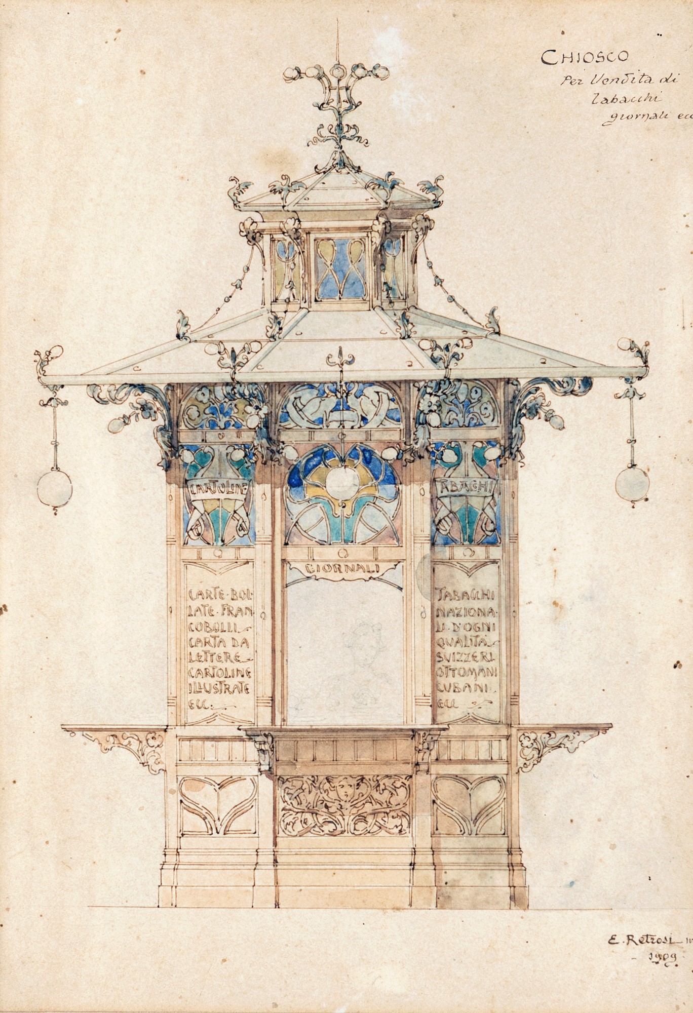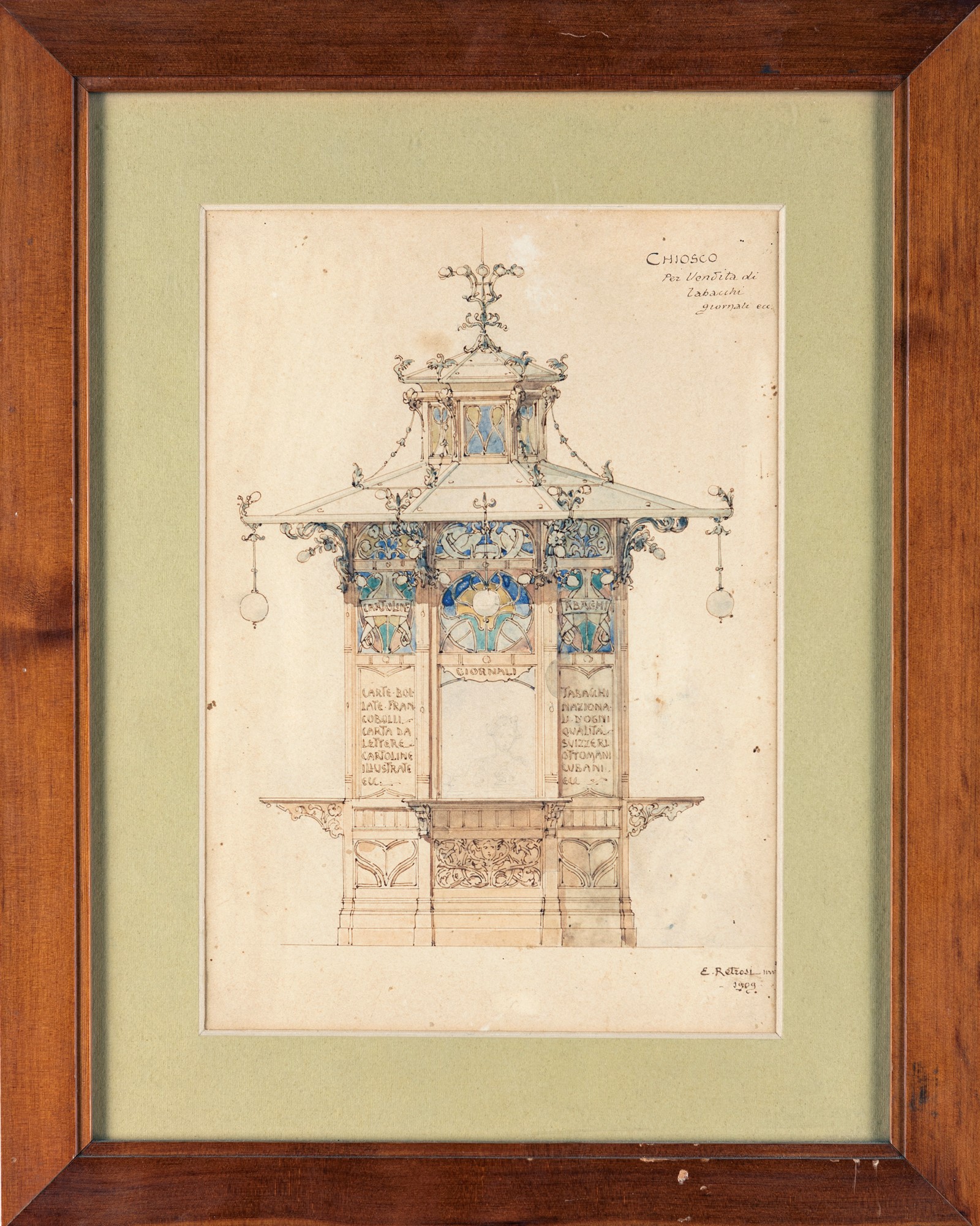 Chioso per vendita di tabacchi giornali ecc. 1909 China, matita e acquarello su carta mm 300x210 - in cornice cm 45x37 Firma e data in basso a destra "E. Retrosi inv. 1909"