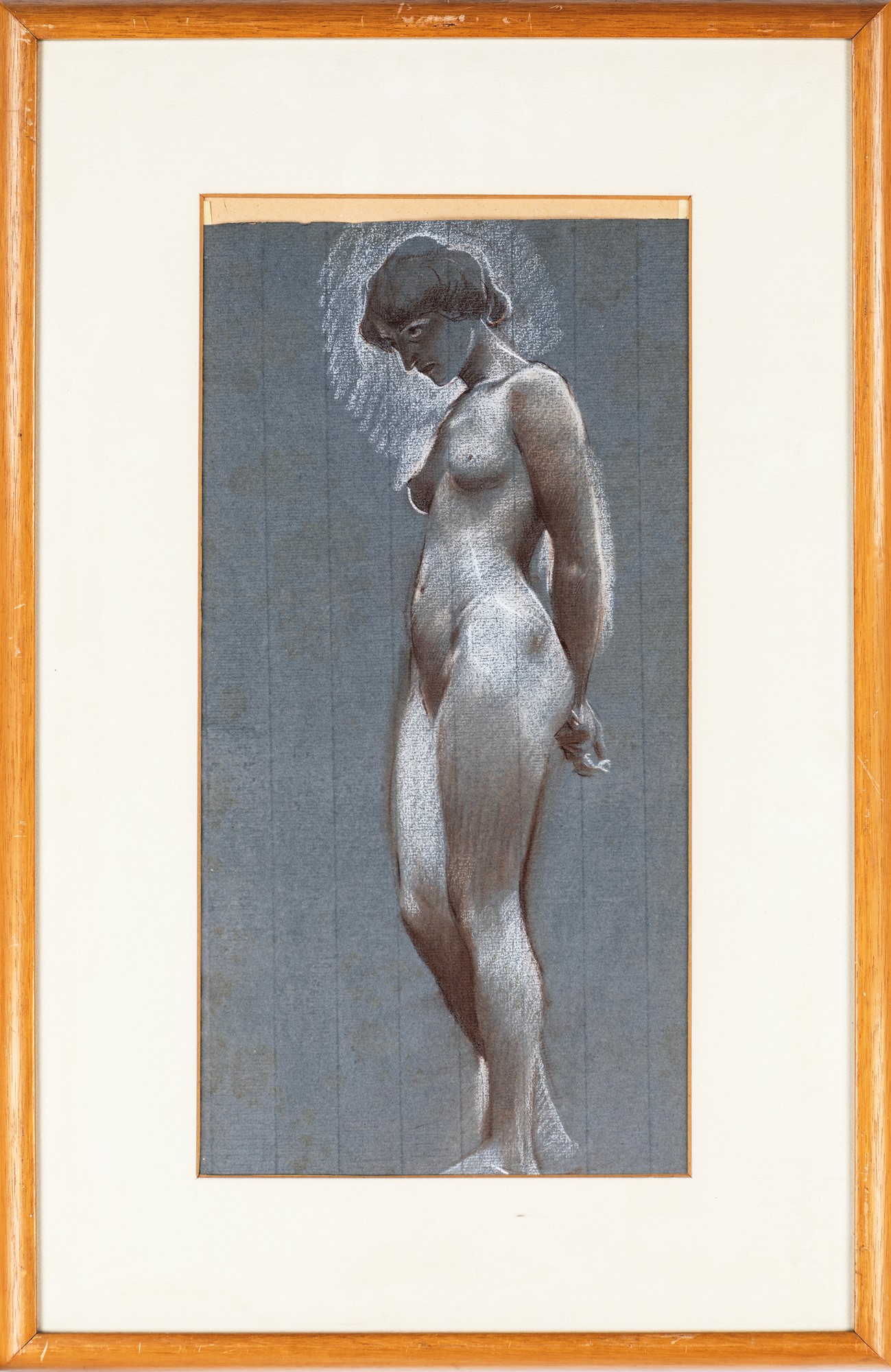 Studio per la figura femminile (la Dea Roma) del pannello centrale del polittico “Sic Transit” (1912) 1910 Grafite e pastelli su carta grigia mm 420x210 - in cornice cm 61x40 Come da sua abitudine, Hirschl ripeteva, anche a distanza di anni, i suoi personaggi già usati in precedenza in altre composizioni, variandone la morfologia, l’età o a volte addirittura il sesso. L’opera qui presentata fa parte di una serie di studi preparatori in parte conservati nel fondo Hirschl del Belvedere di Vienna e in parte nel nostro archivio fotografico per il pannello centrale del grande polittico del Sic Transit oggi conservato presso la Galleria Comunale d’Arte Moderna di Roma.