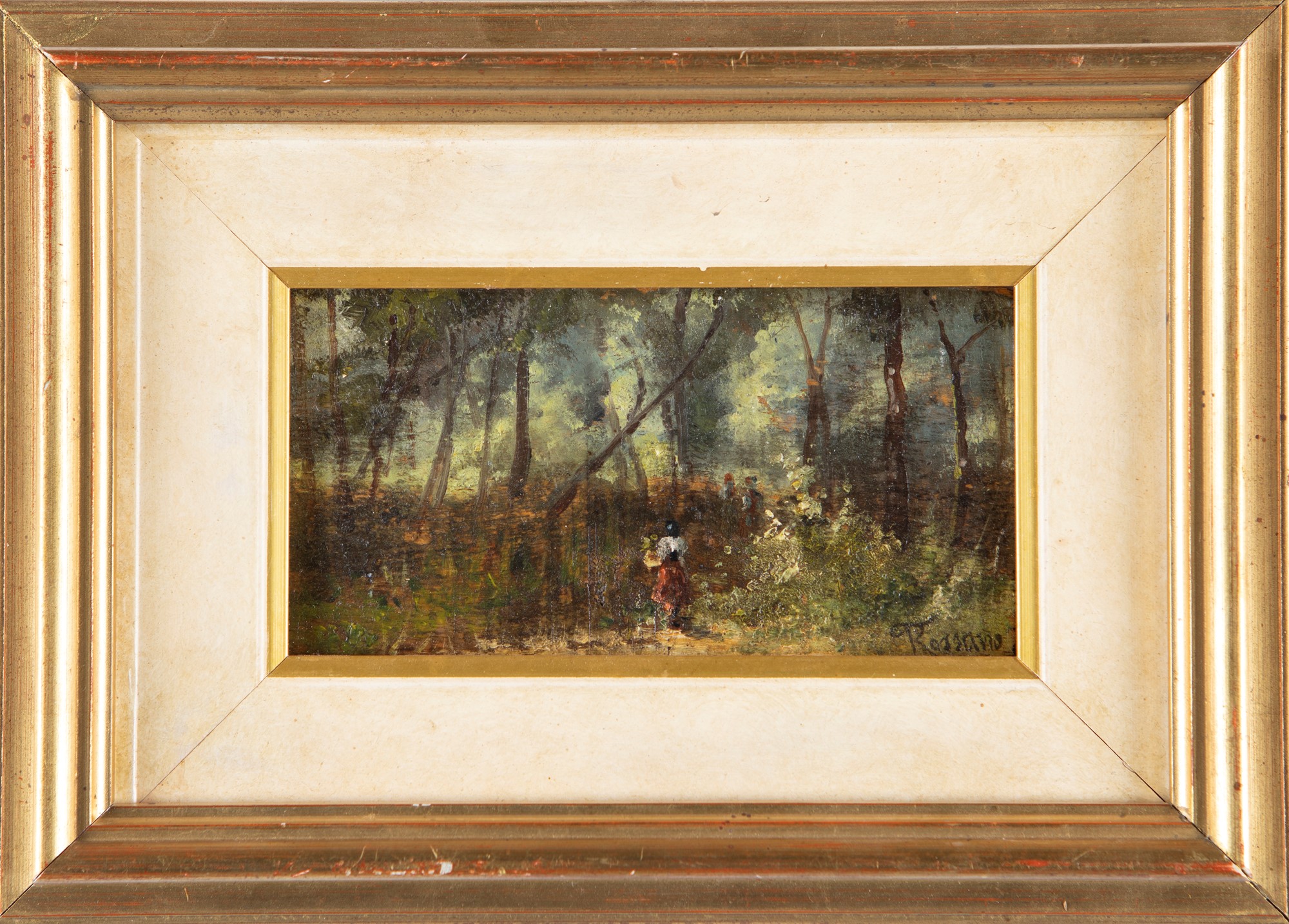 Bosco con figure olio su tavola cm 8x15 - in cornice cm 19x26 Firmato in basso a destra "Rossano"