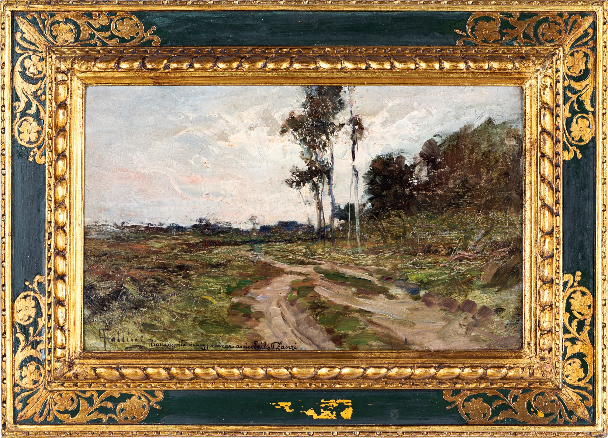 Paesaggio olio su tavola 27x44cm - in cornice cm 60x43,5 Firmato in basso a sinistra "C. Follini" e dedicato ad Emilio Zanzi