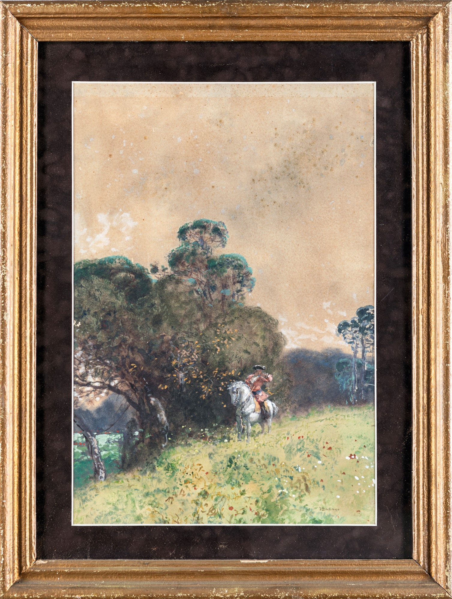 Paesaggio con cavaliere pastelli e tempera su carta cm 52 x 36 - in cornice cm 71 x 53,5 Firmato in basso a destra "E Dalbono"