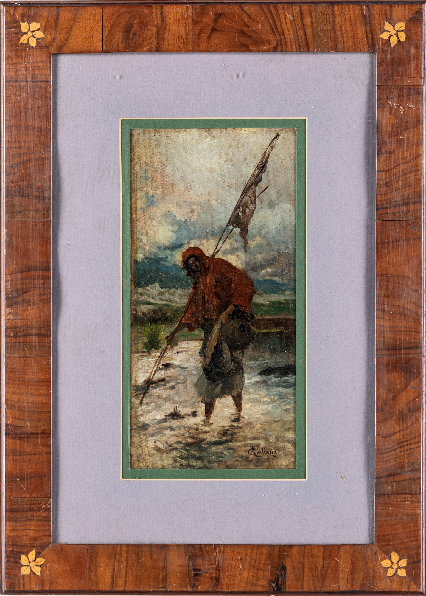 Pescatrice olio su tela applicata su tavola cm 33x17,5 - in cornice cm 56x40 Firmato in basso a destra "B. Giuliano"