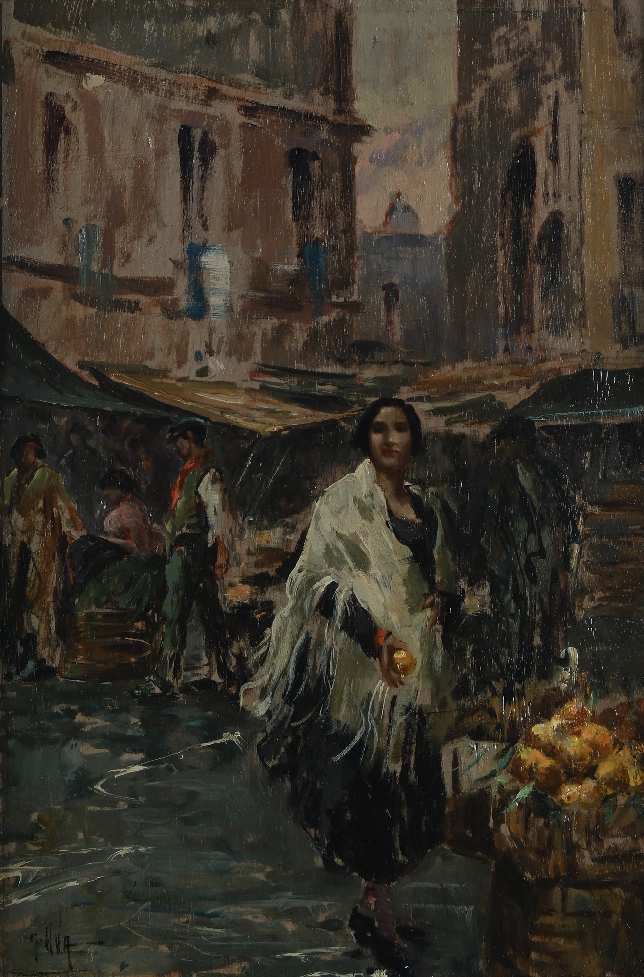 Donna al mercato olio su tavola cm 38x25 - in cornice cm 48x35,5 Firmato in basso a sinistra "G. Uva"