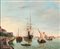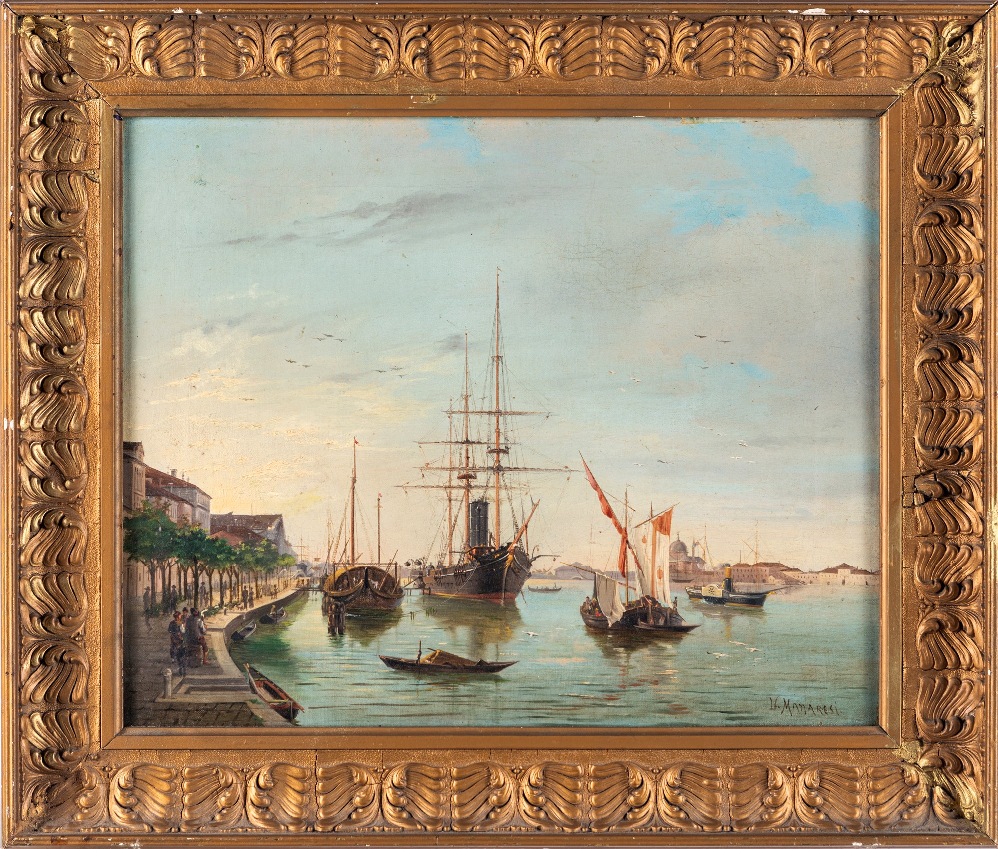 Ugo Manaresi (Ravenna 1851-Livorno 1917) Marina con barche e veliero olio su...