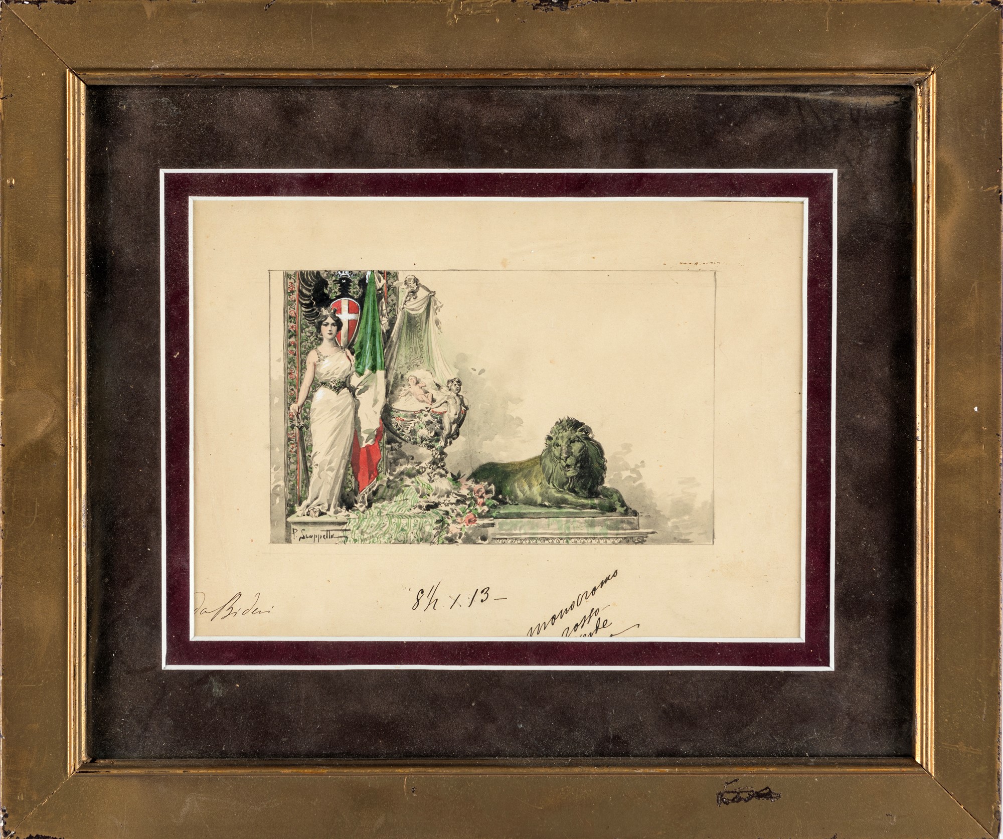 Allegoria dell'Italia - Tavola per illustrazione acquerello e tempera su carta mm 200 x 260 - in cornice cm 34 x 40 Firmato in basso a sinistra "P. Scoppetta"