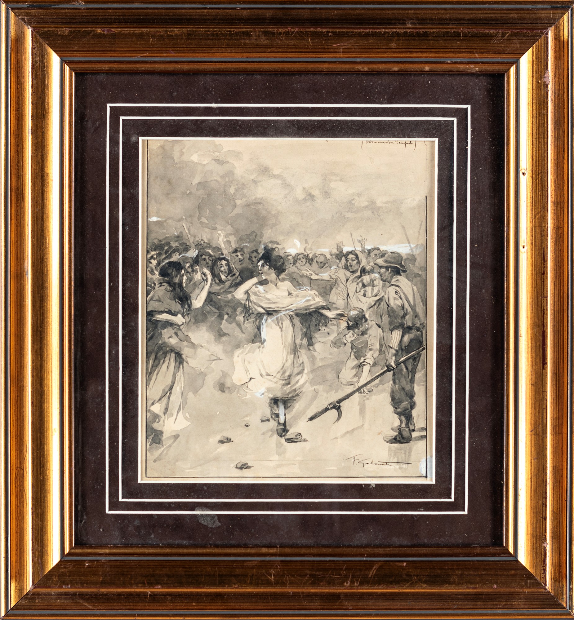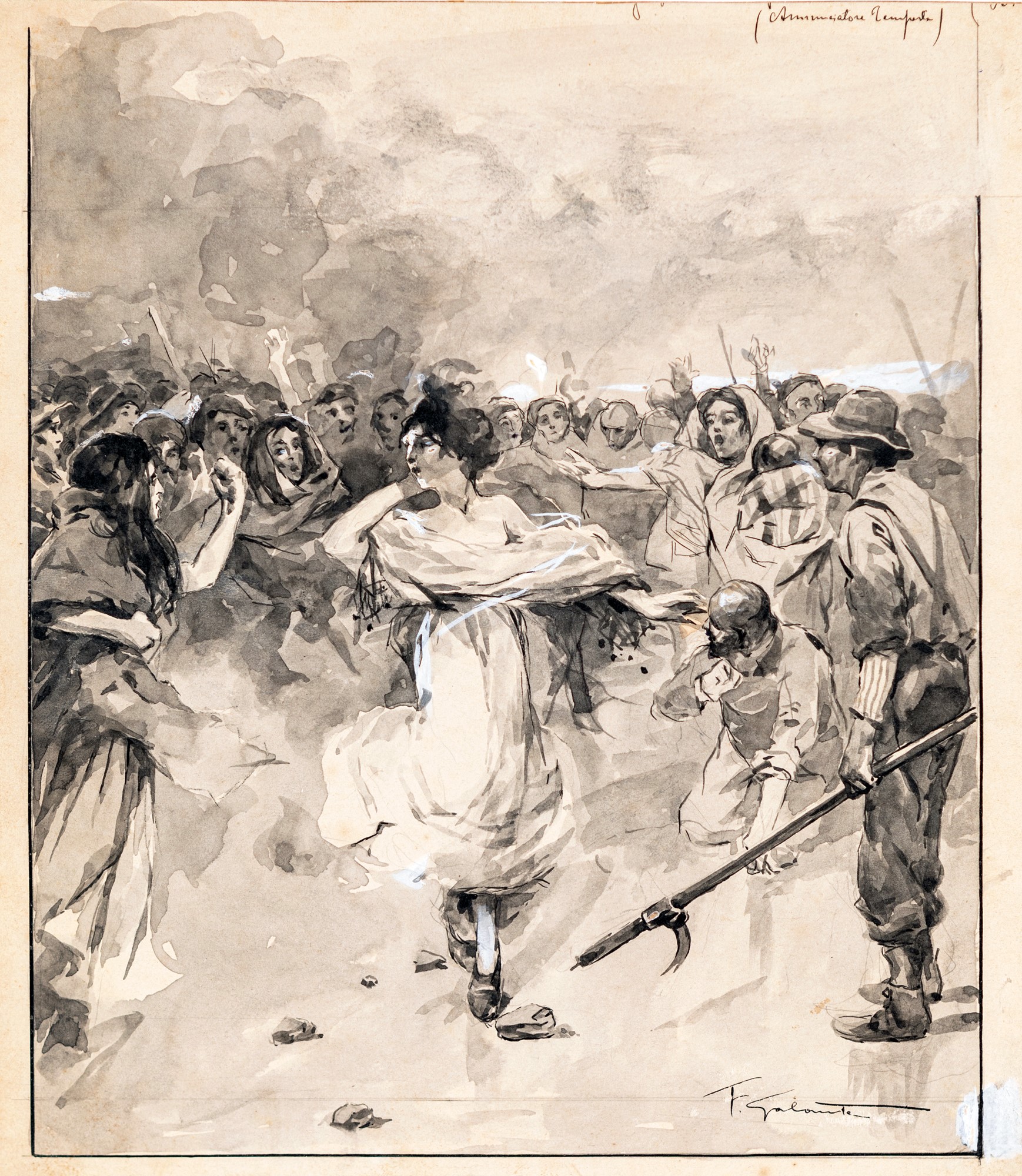 Il dileggio - Tavola per illustrazione acquerello e tempera su carta mm 260x245 - in cornice cm 45,5x42,5 Firmato in basso a destra "F. Galante"; intitolato in alto a destra "(Annunciatore tempesta)"