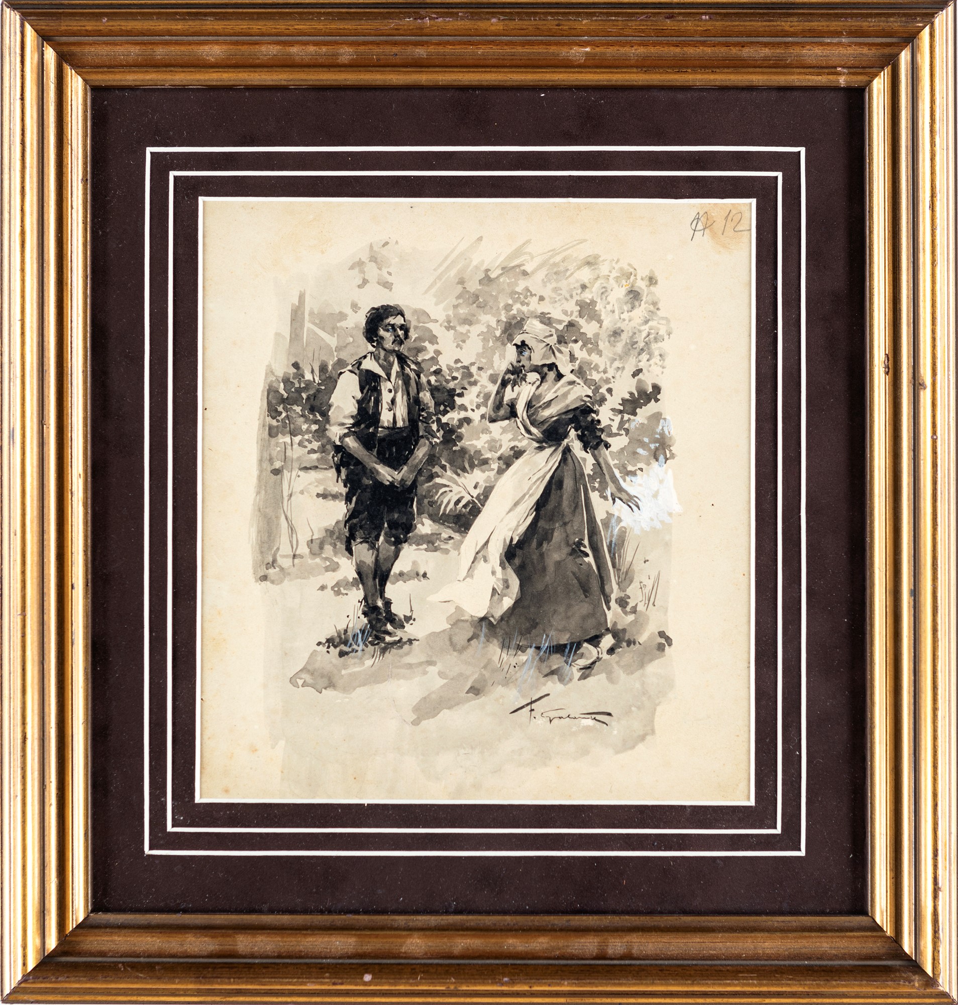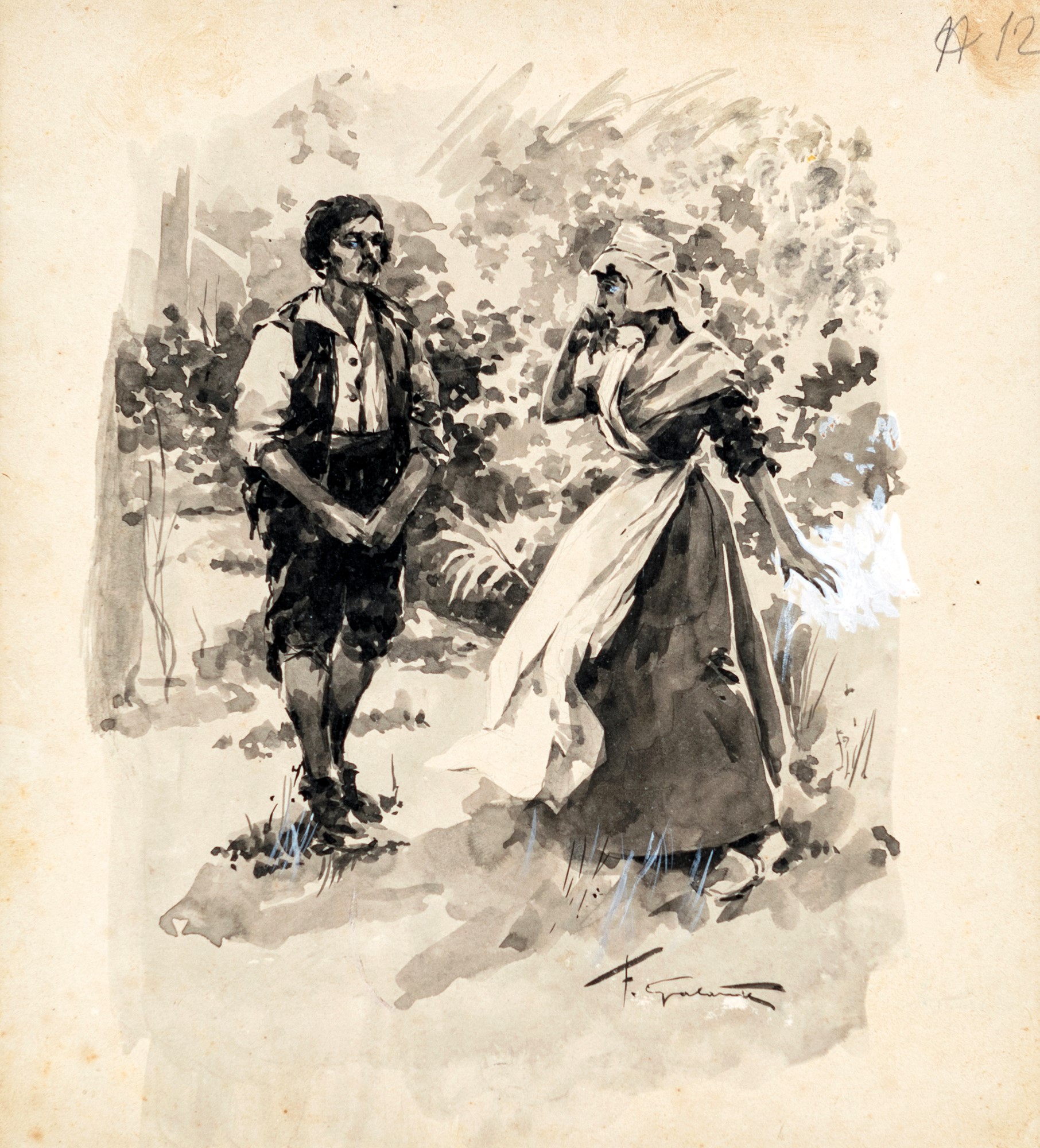 L'Incontro - Tavola per illustrazione di "Racconti della steppa" Inchiostro acquerellato e tempera su carta mm 260 x 240 - in cornice cm 42x40 Firmato in basso a destra "F.Galante"
