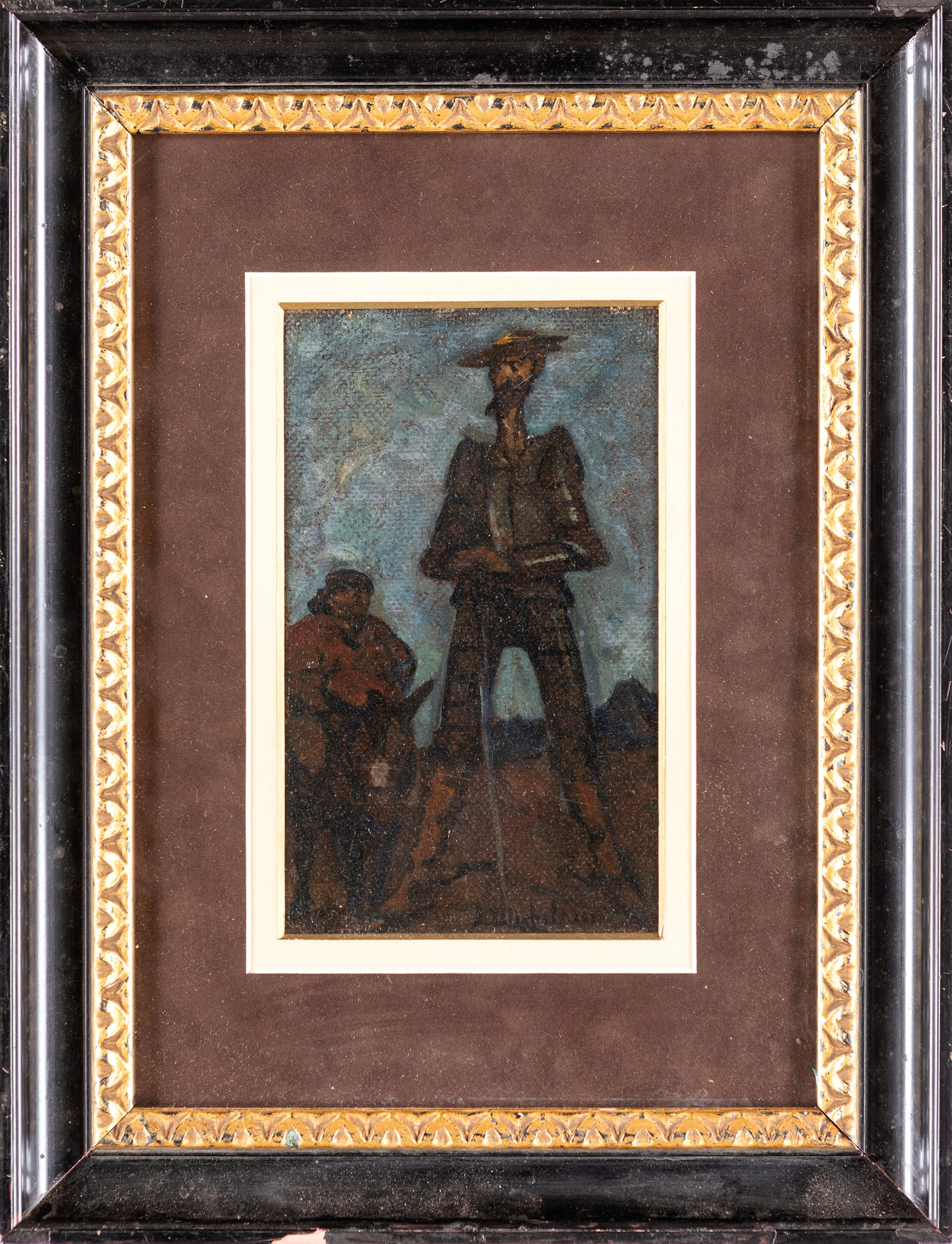 Michelacci - Don Chisciotte e Sancio Panza olio su tela cm 23,5 x 15 - in cornice 44,5 x 34 Firmato in basso a destra "L. Michelacci"