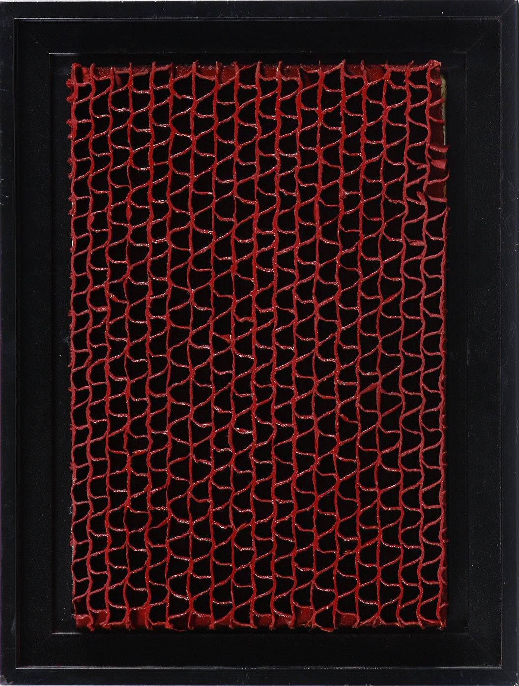 Cartone ondulato dipinto di rosso su tavola.