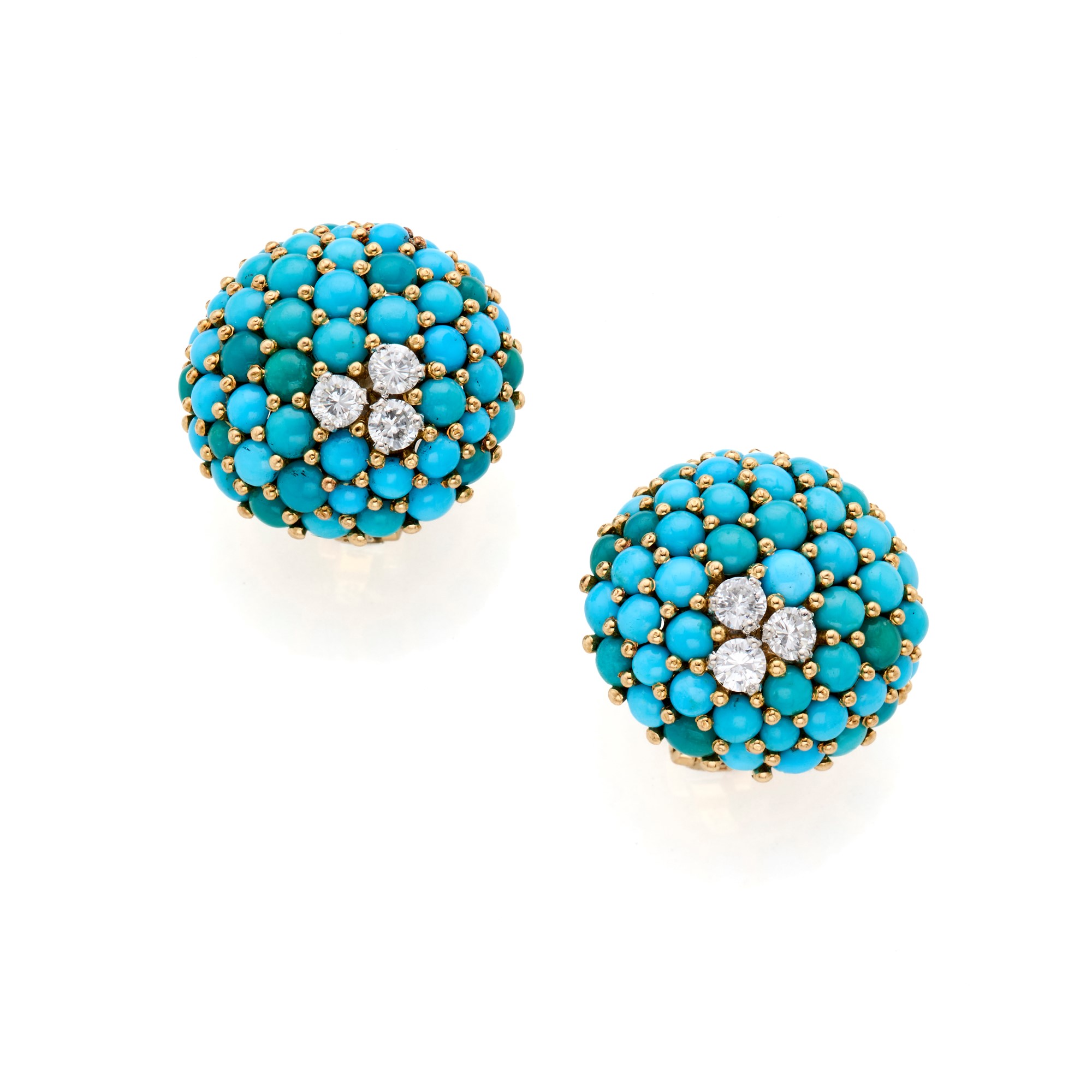 Orecchini in oro giallo 18 Kt con diamanti rotondi per complessivi circa 0,70 ct e boules di turchese