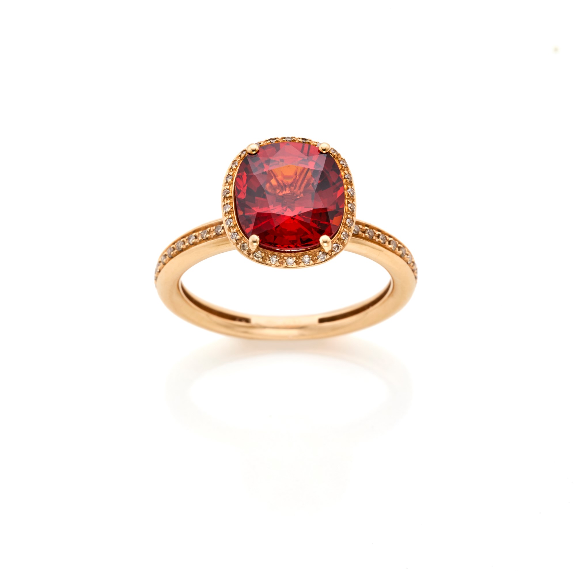 18 Kt rose gold ring with round diamonds totalling approx. 0,15 ct and cushion garnet of approx. 3 ct