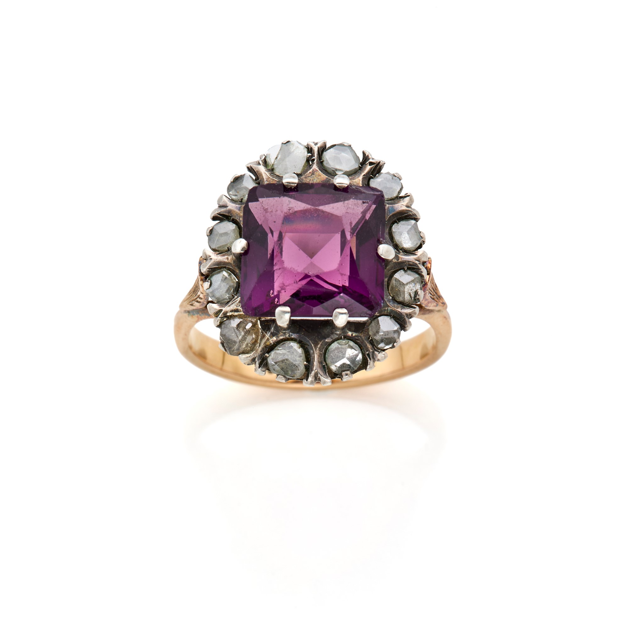 Anello in oro giallo 18 Kt e argento con diamanti taglio mezza rosetta e ametista rettangolare di circa 4,75 ct