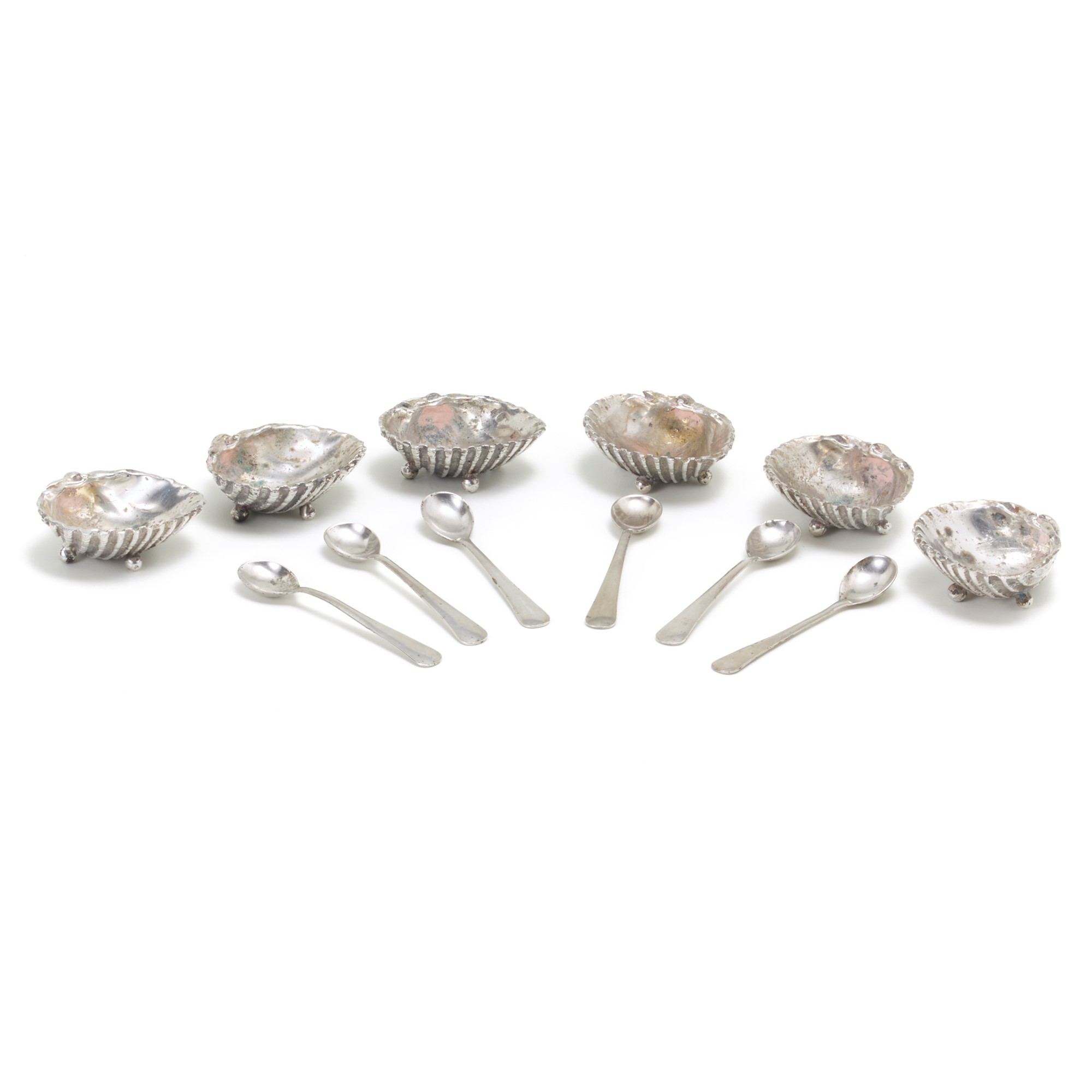 Silver set consisting of six shell-shaped salt cellars and six spoons, complete with original box