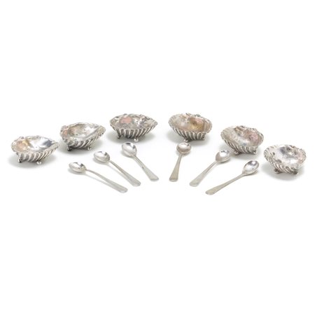 Set in argento composto da sei saliere a forma di valva di conchiglia e sei cucchiaini, corredato di scatola originale