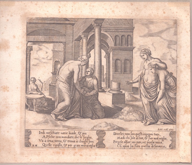 dalla serie con la storia di Amore e Psiche da Michiel Coxie I. Bulino, 200 x 233 mm (lastra), 239 x 296 mm (foglio). Stato III su 4, con l'indirizzo di Antonio Salamanca. Bartsch XV.60.