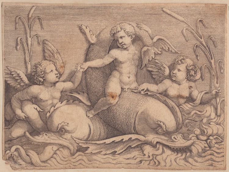 Adamo Scultori (1530-1585). Tre putti con mostri marini