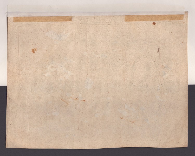 Bella e fresca impressione su carta vergata. Esemplare rifilato, in ottimo stato di conservazione salvo due piccolissime macchie e residui di scotch al verso. Fissato su un supporto moderno.