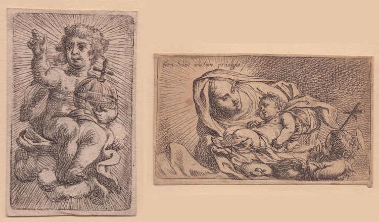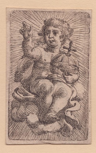 B. Gesù Infante con globo. Acquaforte, 78 x 49 mm. Al verso due timbri (Lugt 1606 e Lugt 1672).