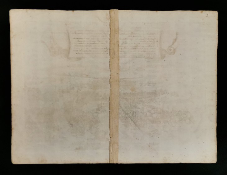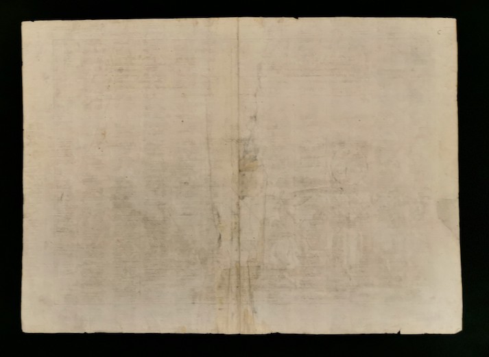 Esemplare fresco, stampato su carta vergata, con bella inchiostratura in discrrete condizioni generali: leggera ossidazione in corrispondenza della piega centrale di pubblicazione; foglio completo con grandi margini, presente strappo lungo il margine superiore e qualche altro piccolo difetto.