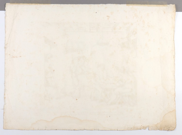 Bella impressione su carta non vergata. Foglio con alcuni strappi lungo i bordi, due gore in basso e qualche latra piccola macchia, sgualciture. Per il resto in buono stato.