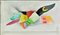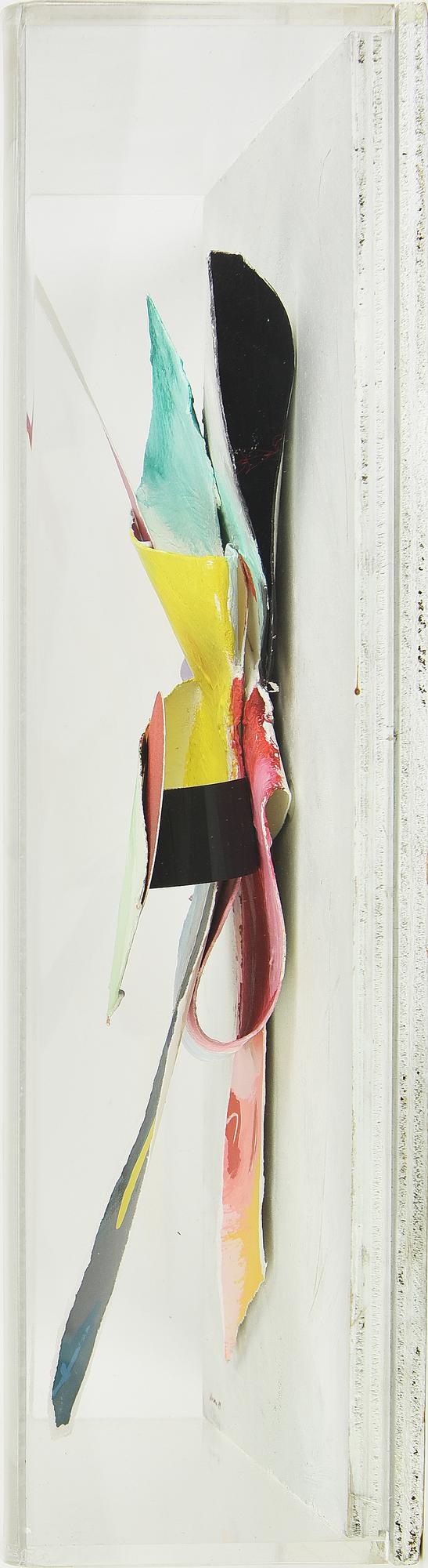 assemblaggio polimaterico su tavola con interventi pittorici, cm 37,5x21,5x10