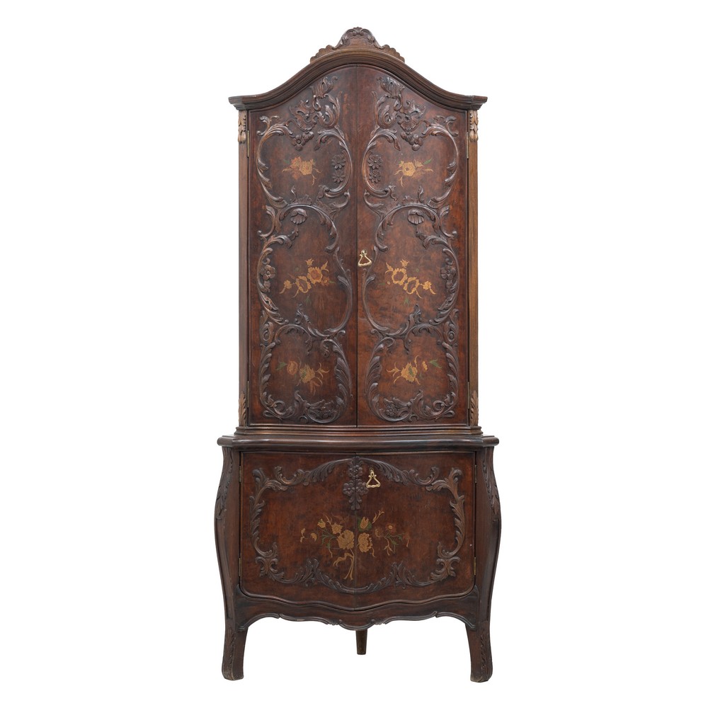 ANGOLIERA doppio corpo in legno di noce e radica di noce, tarsie in varie essenze di frutto.