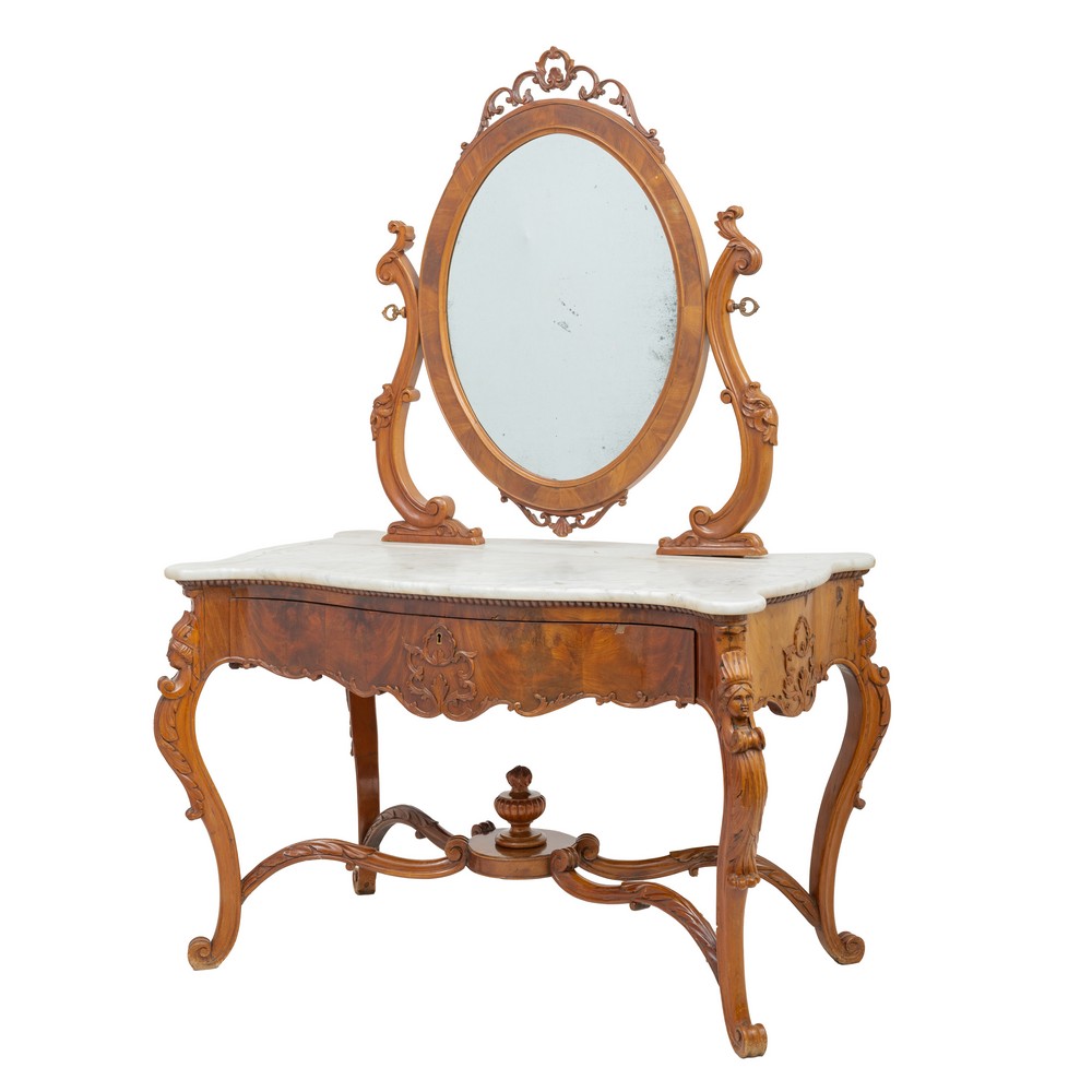 Toletta Luigi Filippo con cassetto centrale in legno di mogano e piuma di mogano, specchio basculante e piano in marmo bianco di Carrara.