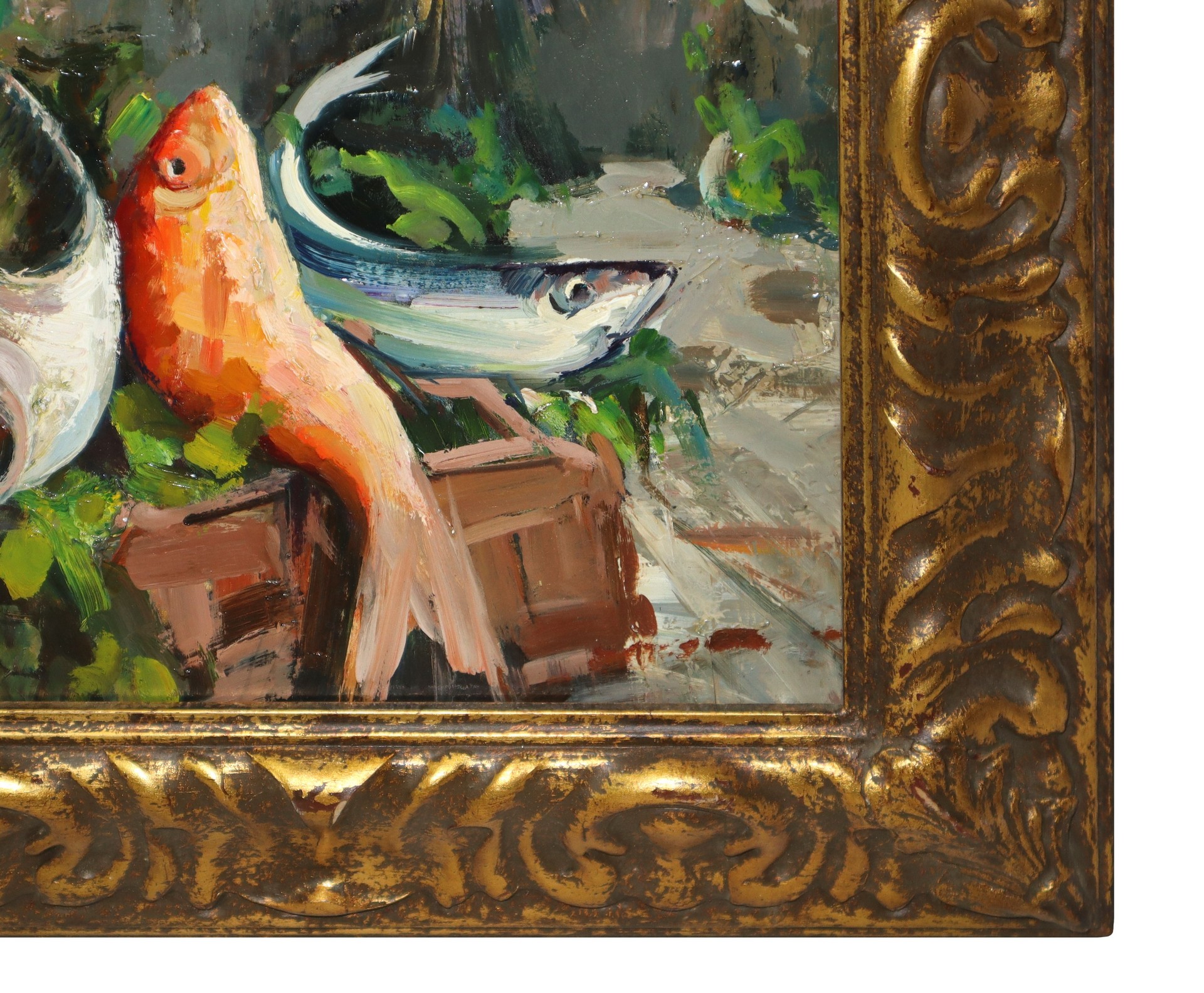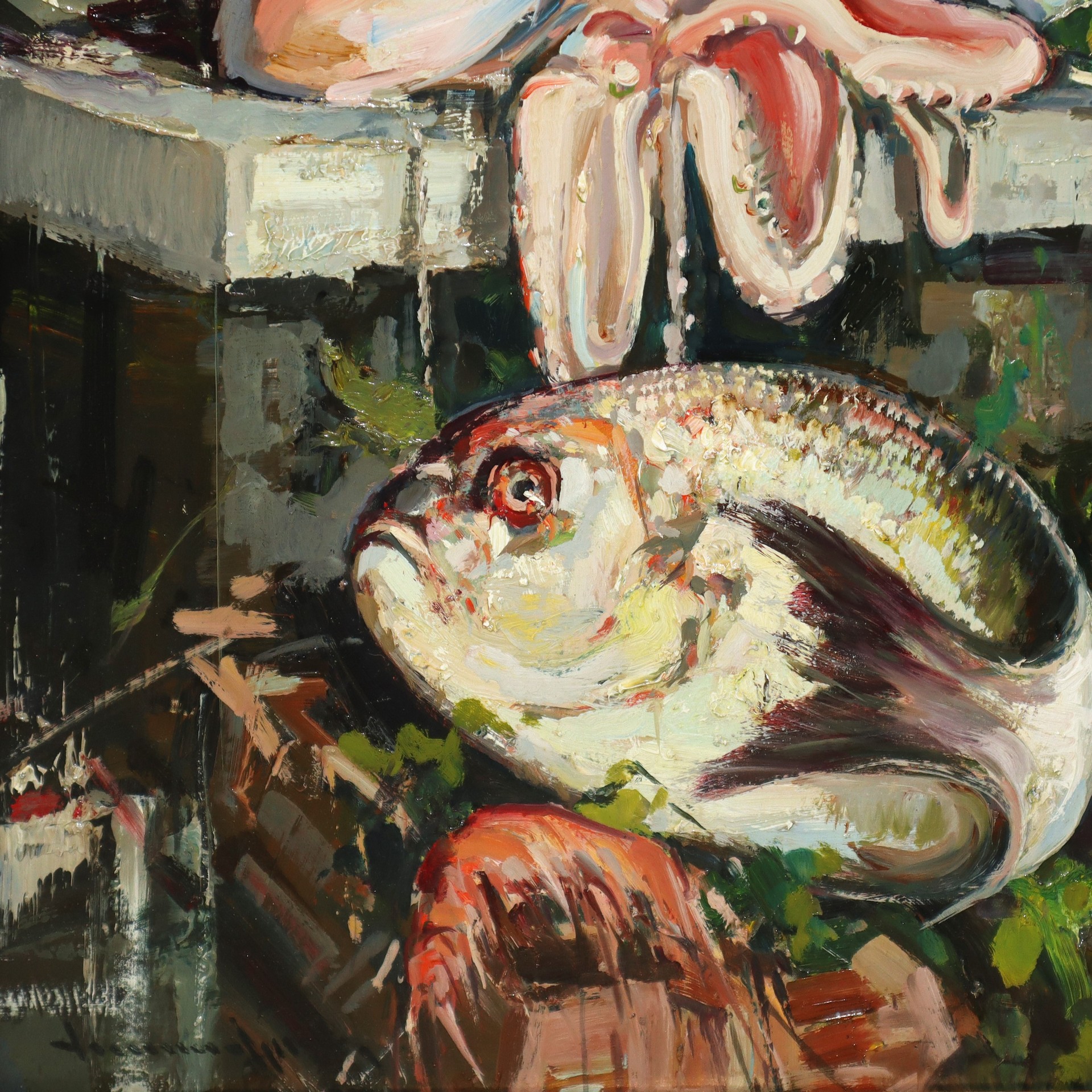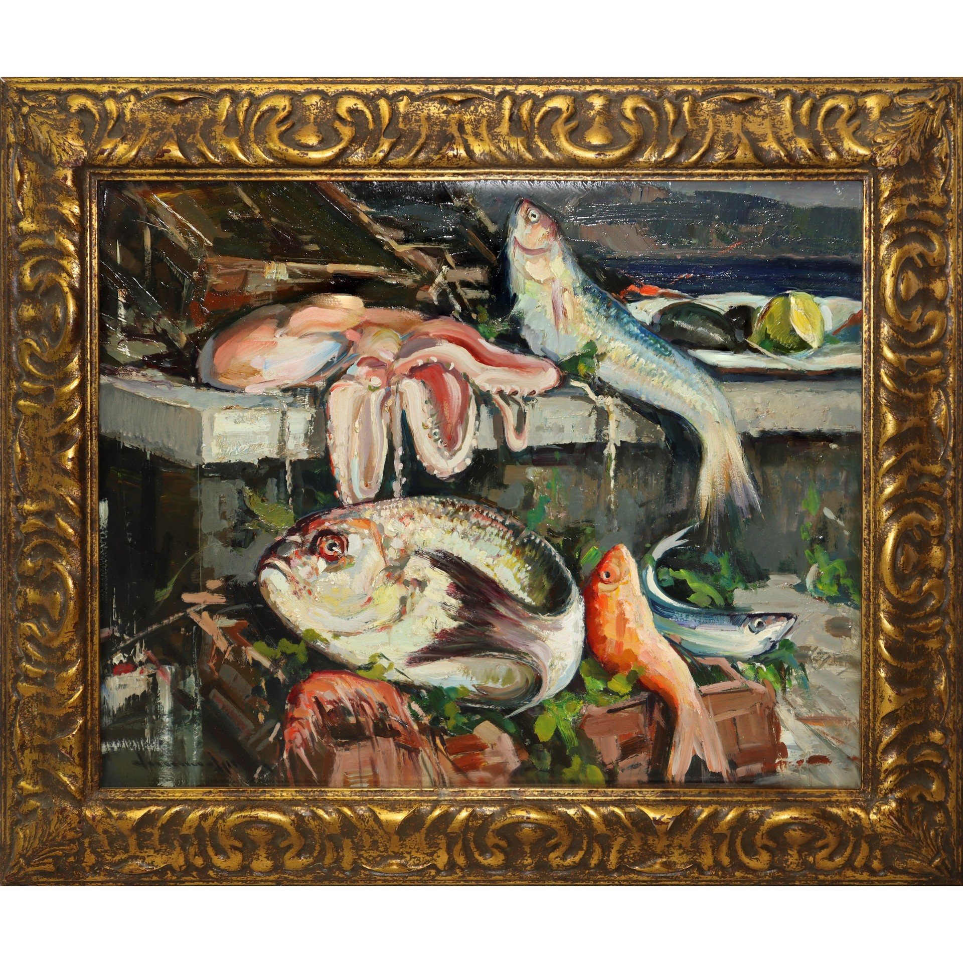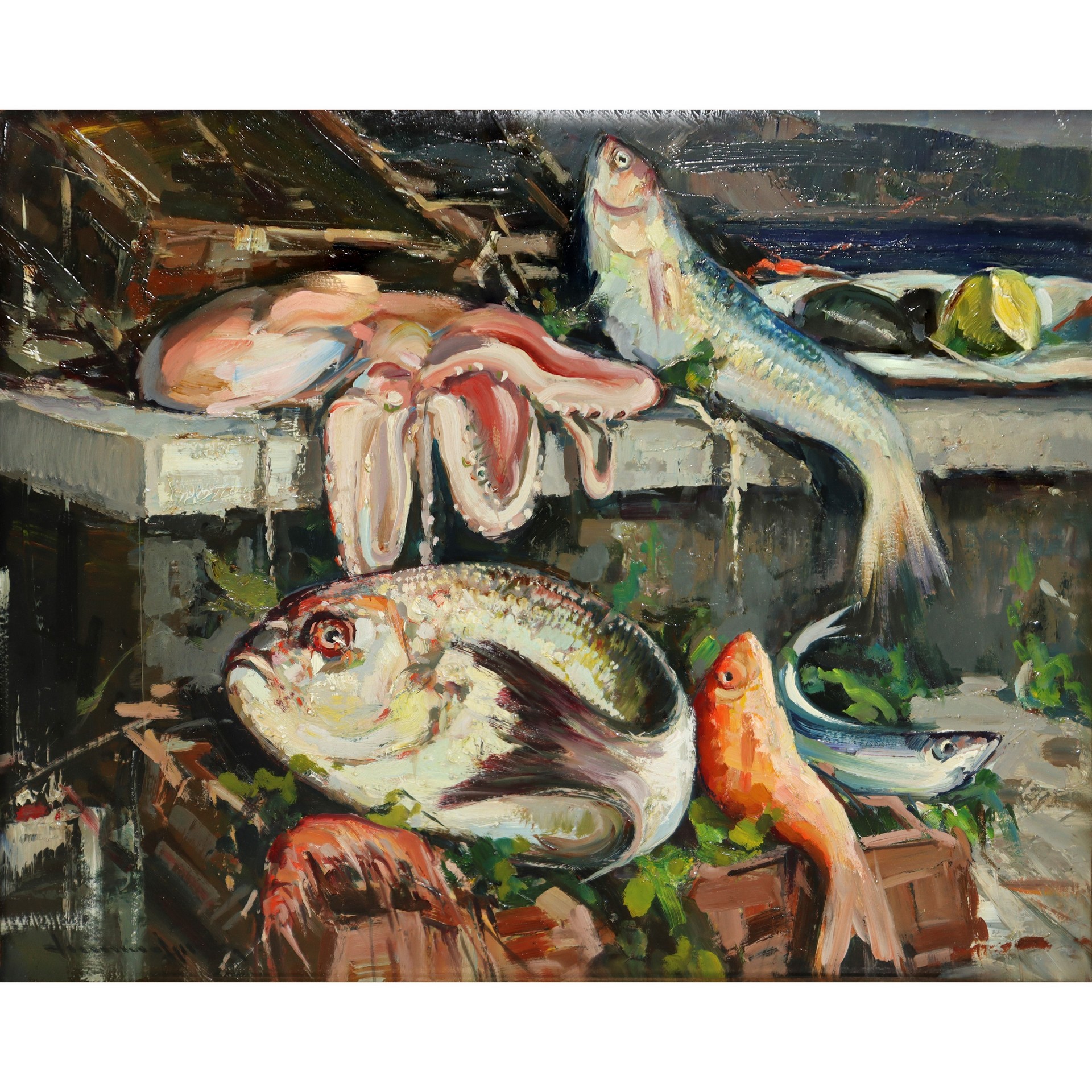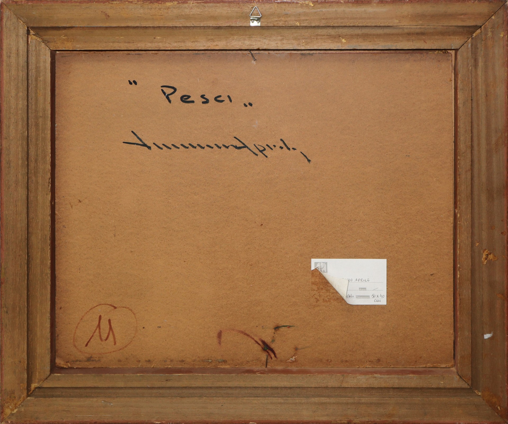 Vincenzo Aprile (Napoli 1952) - Pesci H cm 50 x 40, (in cornice) cm 53 x 63 Olio su tavola Firmato sul fronte in basso a sinistra. Firma e titolo al retro. Etichetta descrittiva al retro. Autentica dell'artista su fotografia.