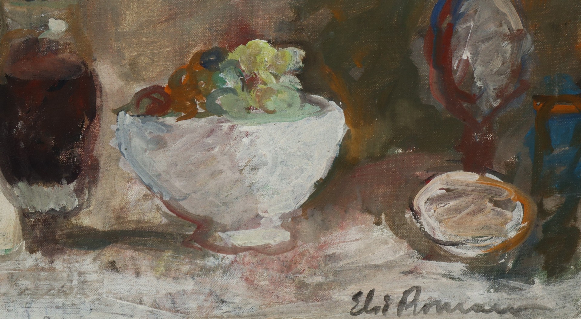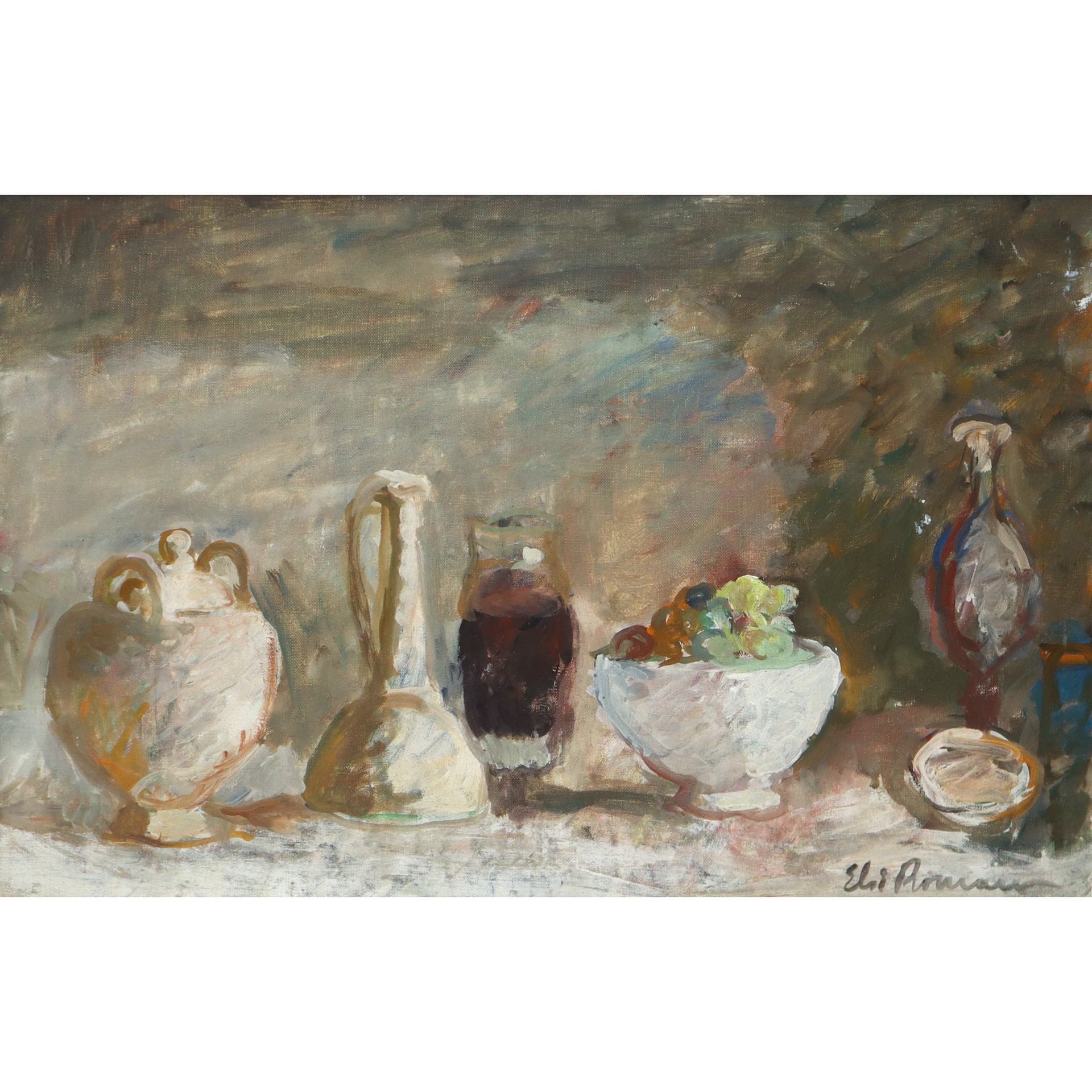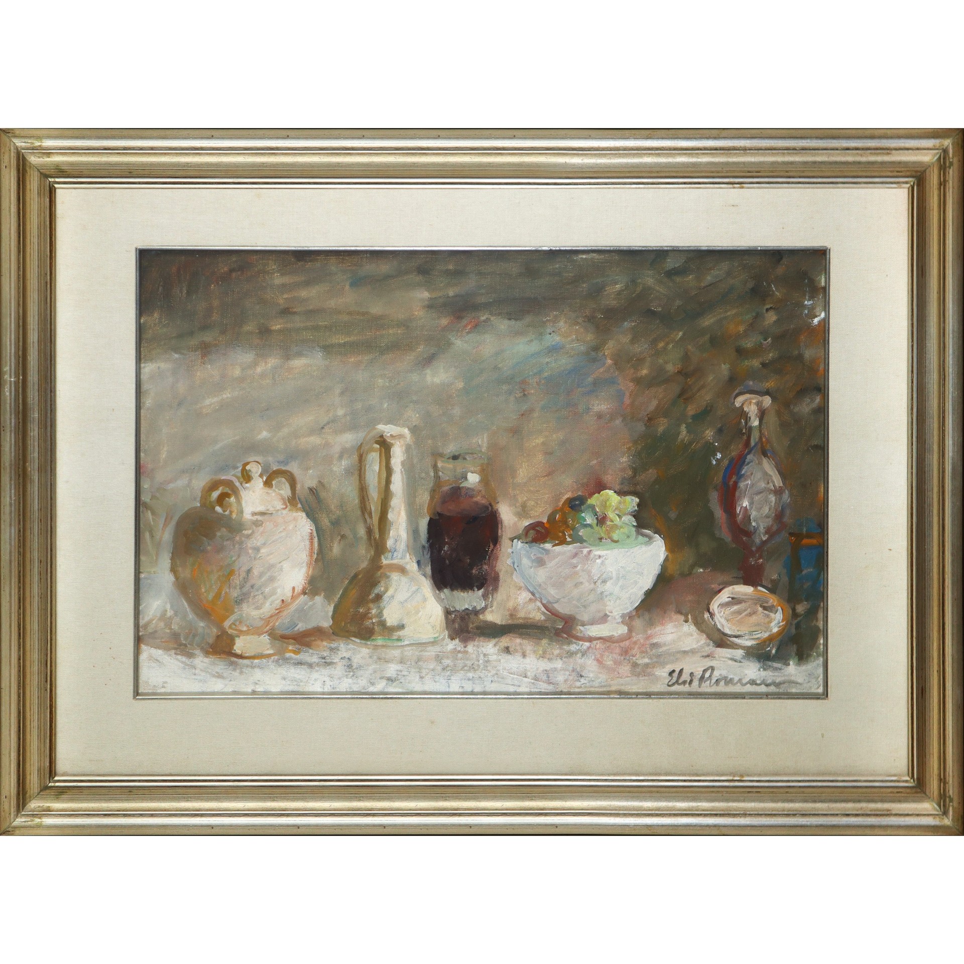 Elio Romano (Trapani 1909-Catania 1996) - Natura morta con brocca di vino H cm 39,5 x 60; (in cornice) H cm 63 x 84 Olio su tela Firmato in basso a destra.