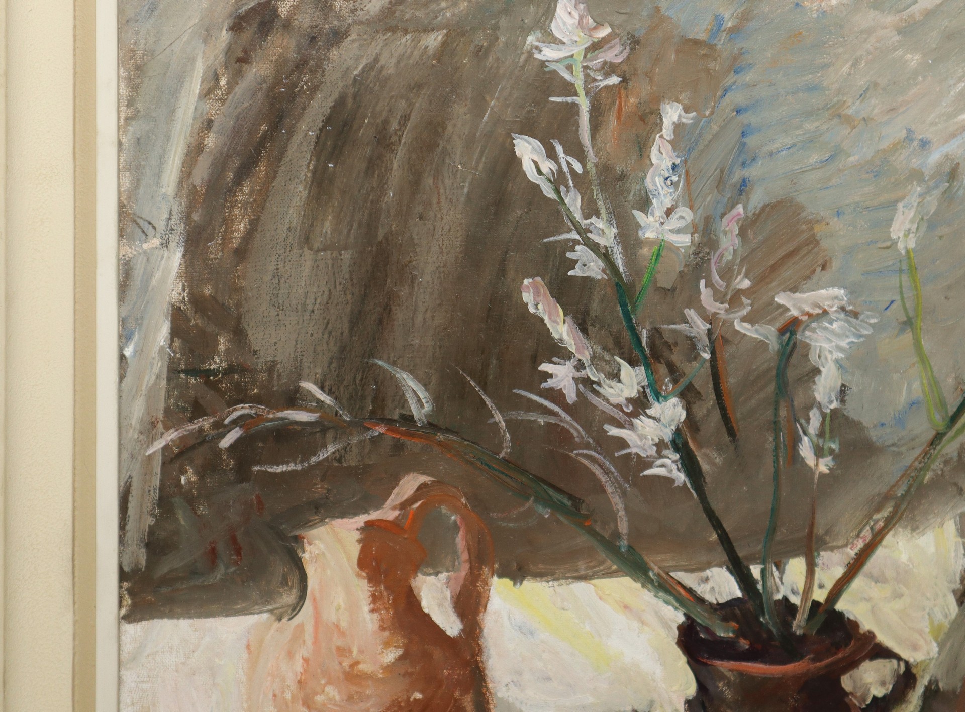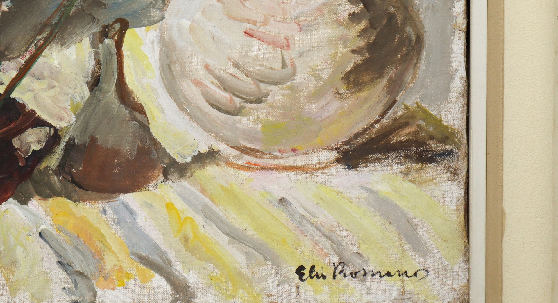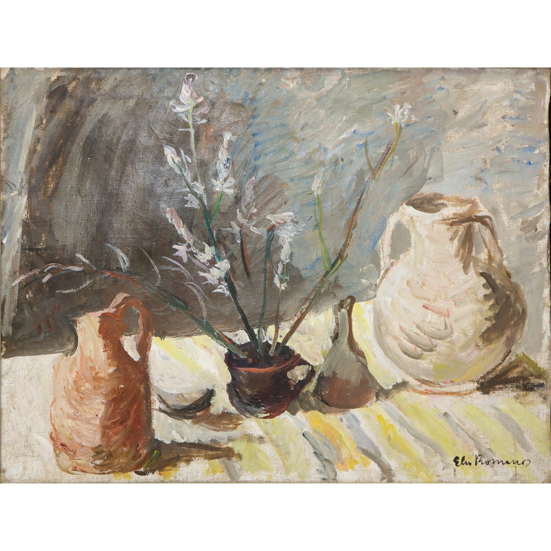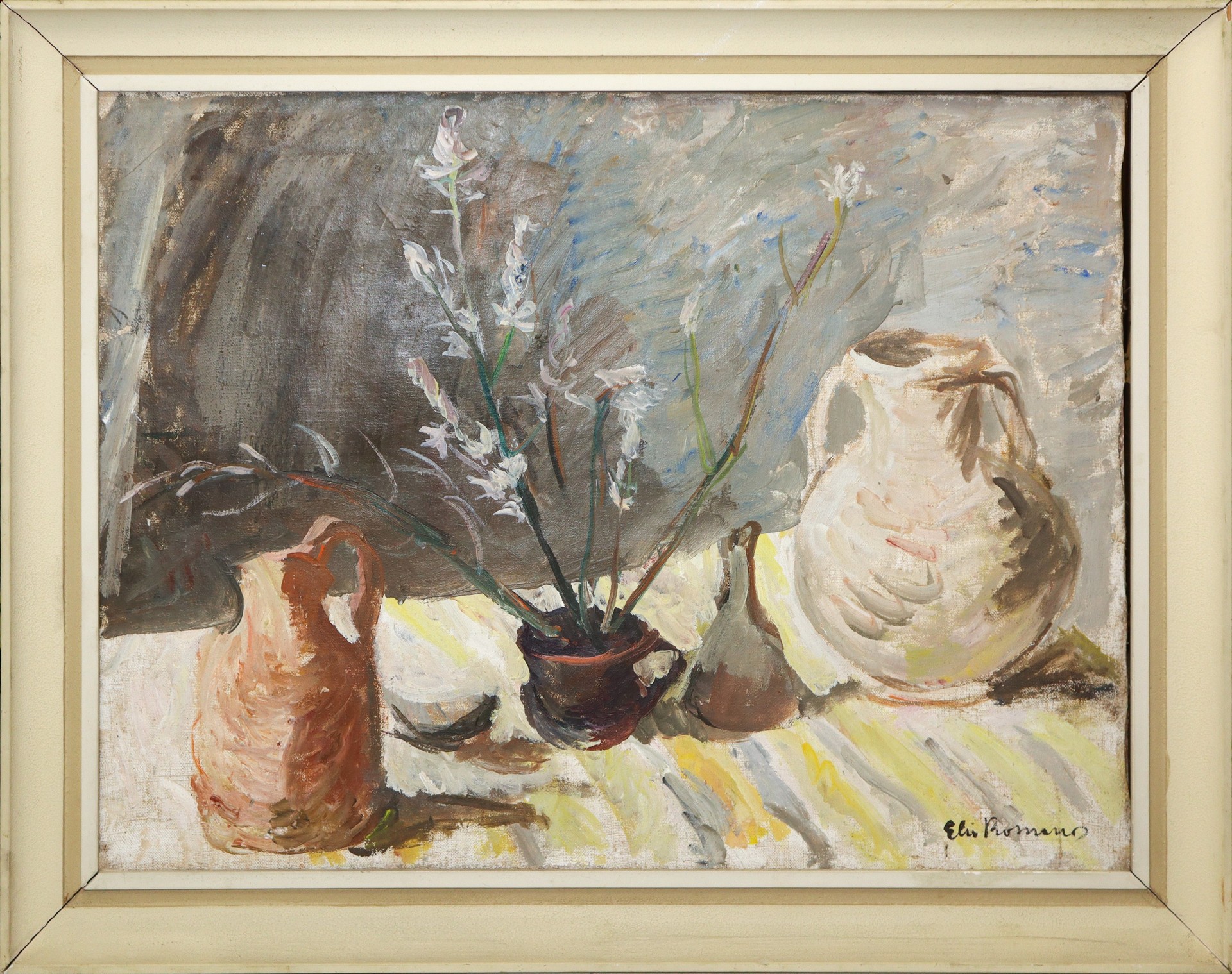 Elio Romano (Trapani 1909-Catania 1996) - Pianta con vasi H cm 53 x 70; (in cornice) H cm 65,5 x 82,5 Olio su tela. Firmato in basso a destra.