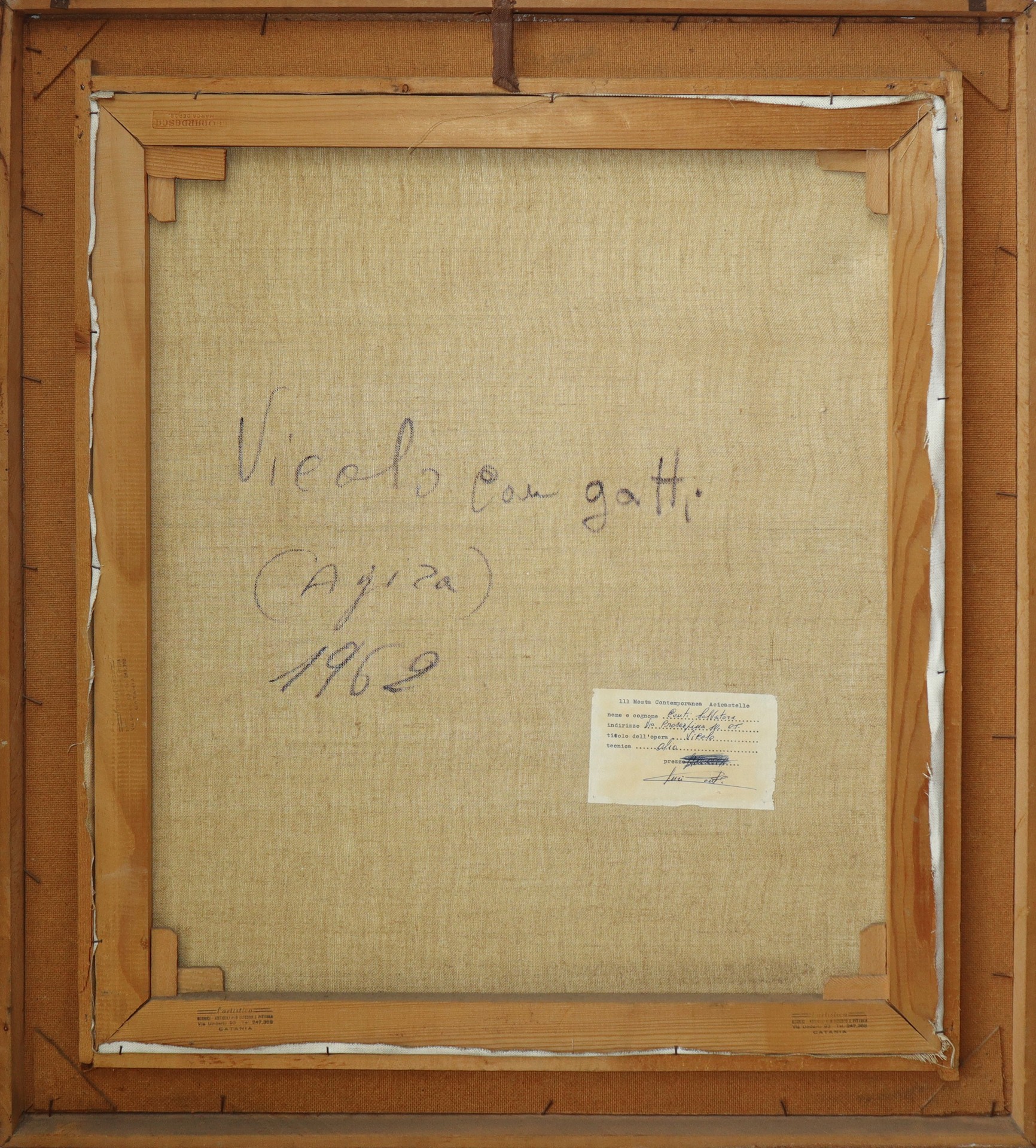 Salvatore Conti - Vicolo con gatti, Agira, 1962 H cm 70x60 - in cornice H cm 84x74 Olio su tela. Firmato in basso a destra. Al retro titolato e datato. Etichetta Mostra Contemporanea di Aci Castello