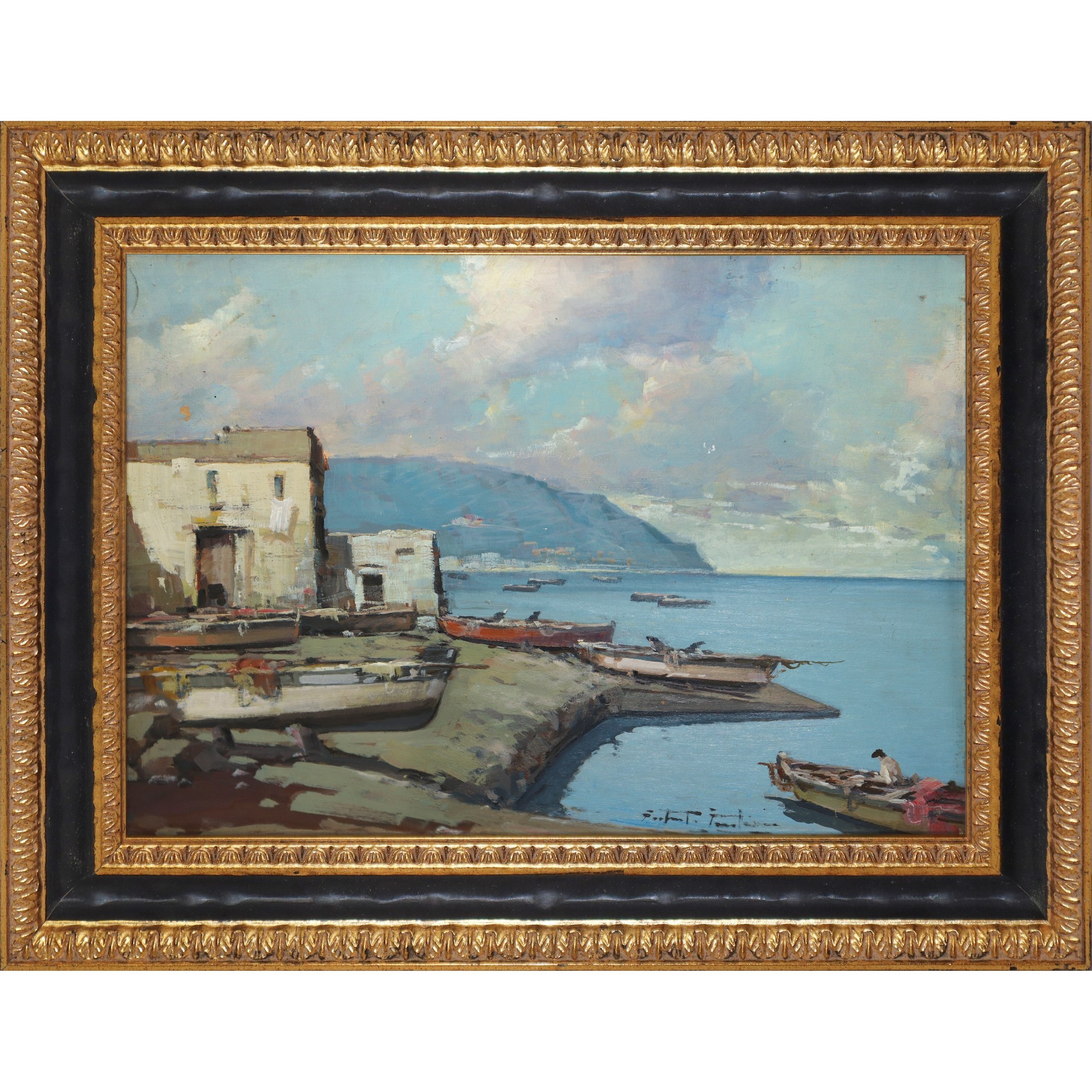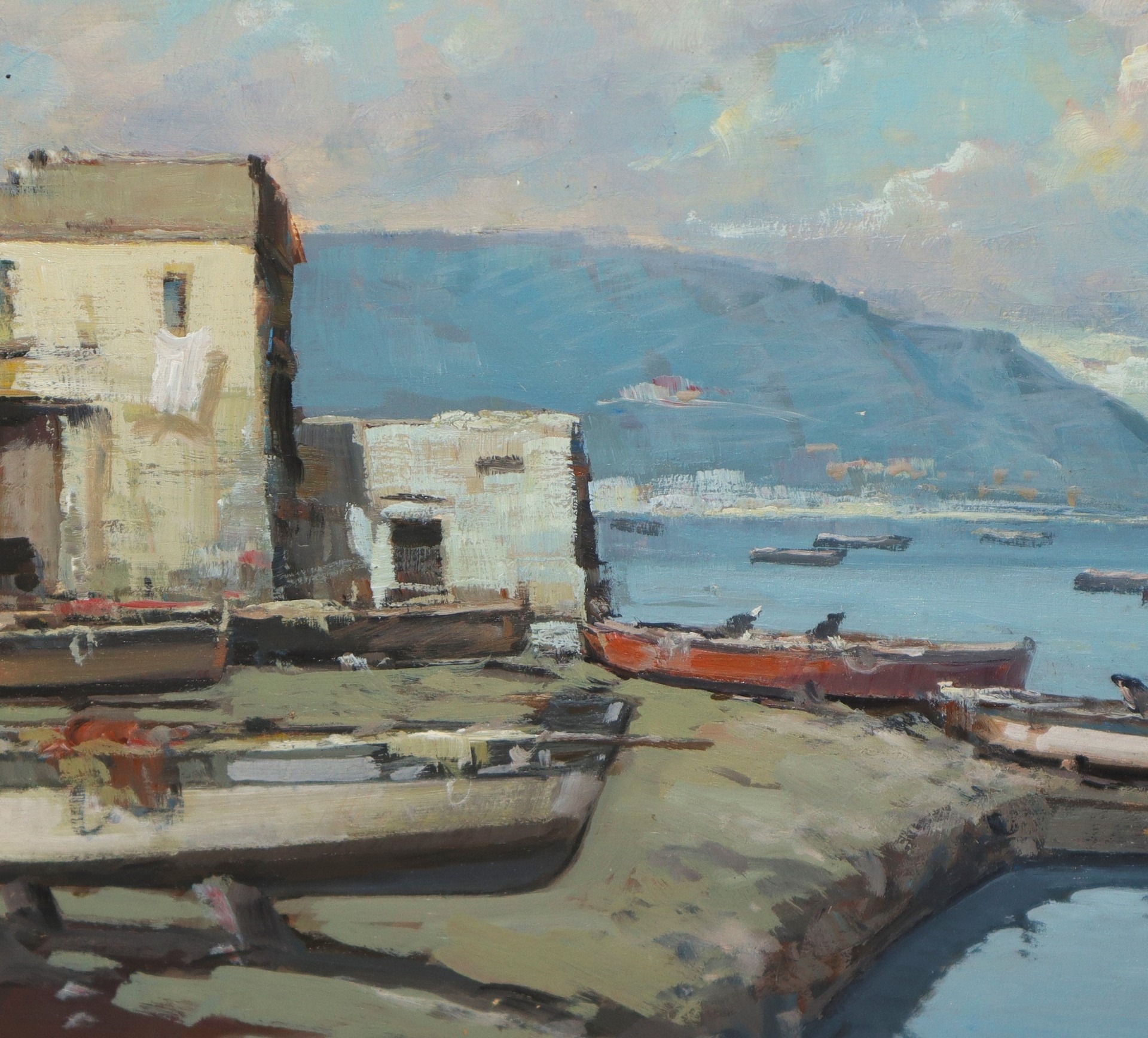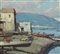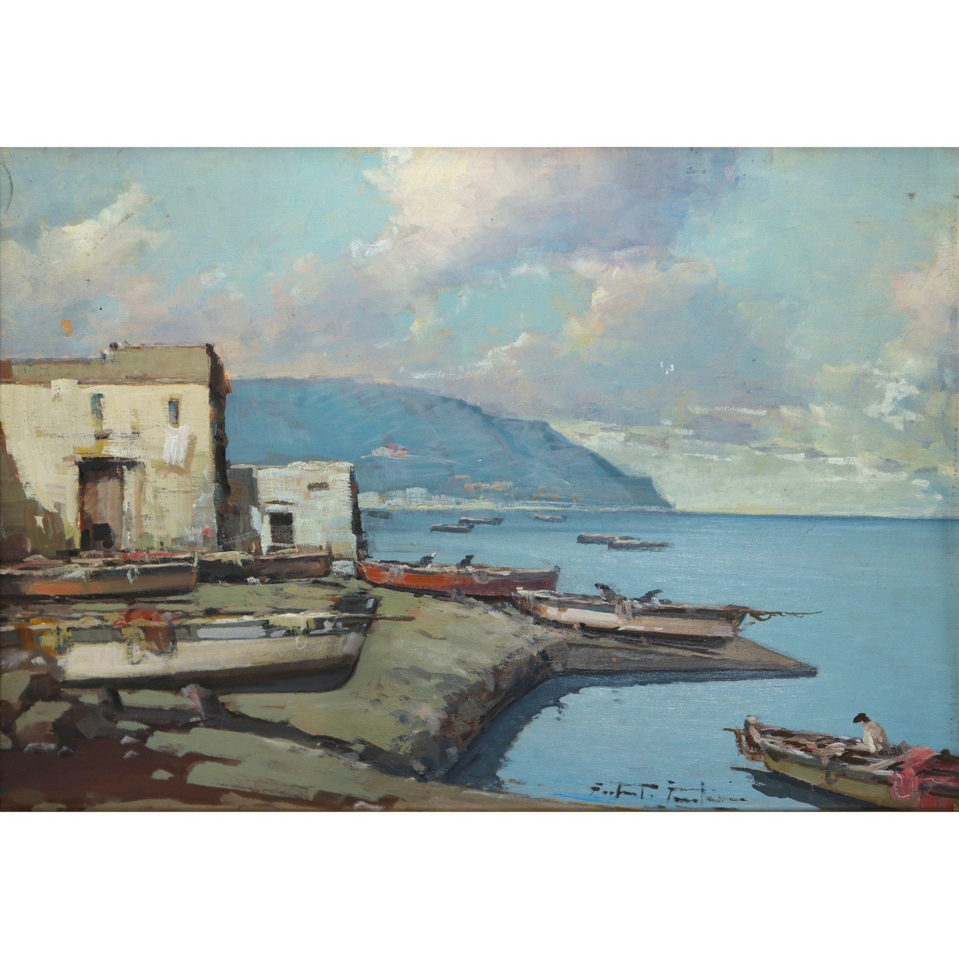 Fortunato Fontana (Napoli 11/02/1936) - Marina mediterranea con barche e pescatori e due casette