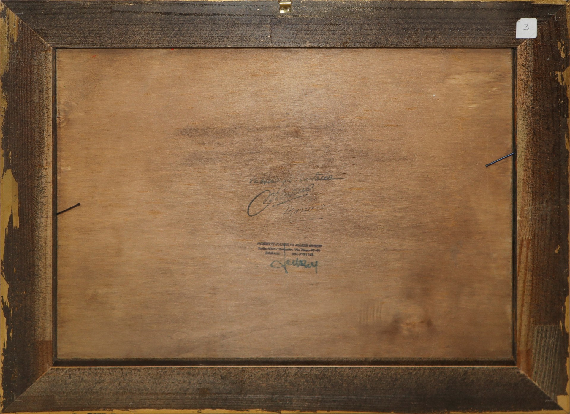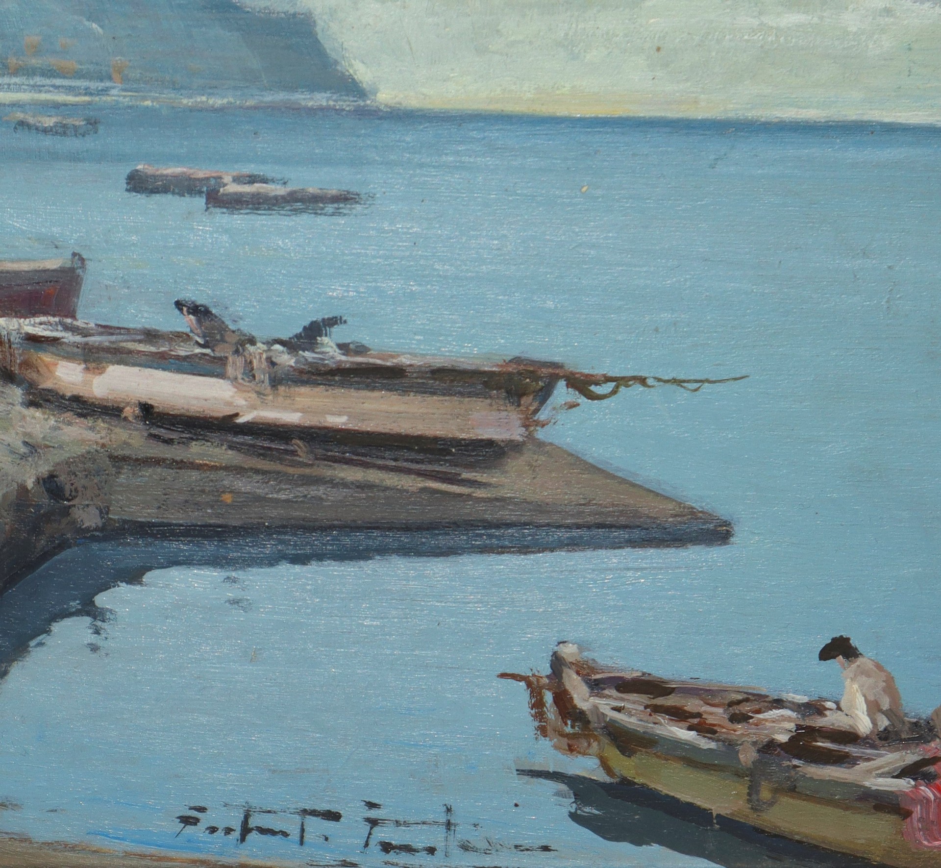 Fortunato Fontana (Napoli 11/02/1936) - Marina mediterranea con barche e pescatori e due casette H cm 30x40 - in cornice H cm 39.5x50 Olio su tavola Firmato in basso a destra