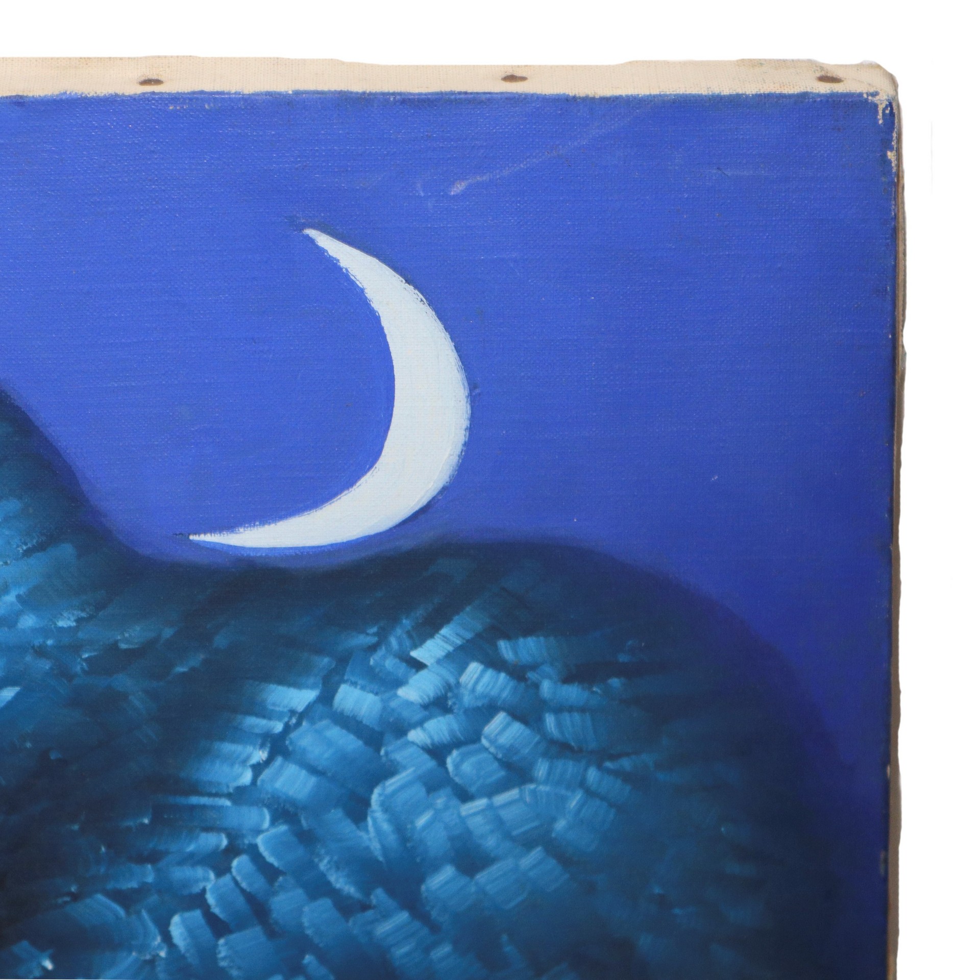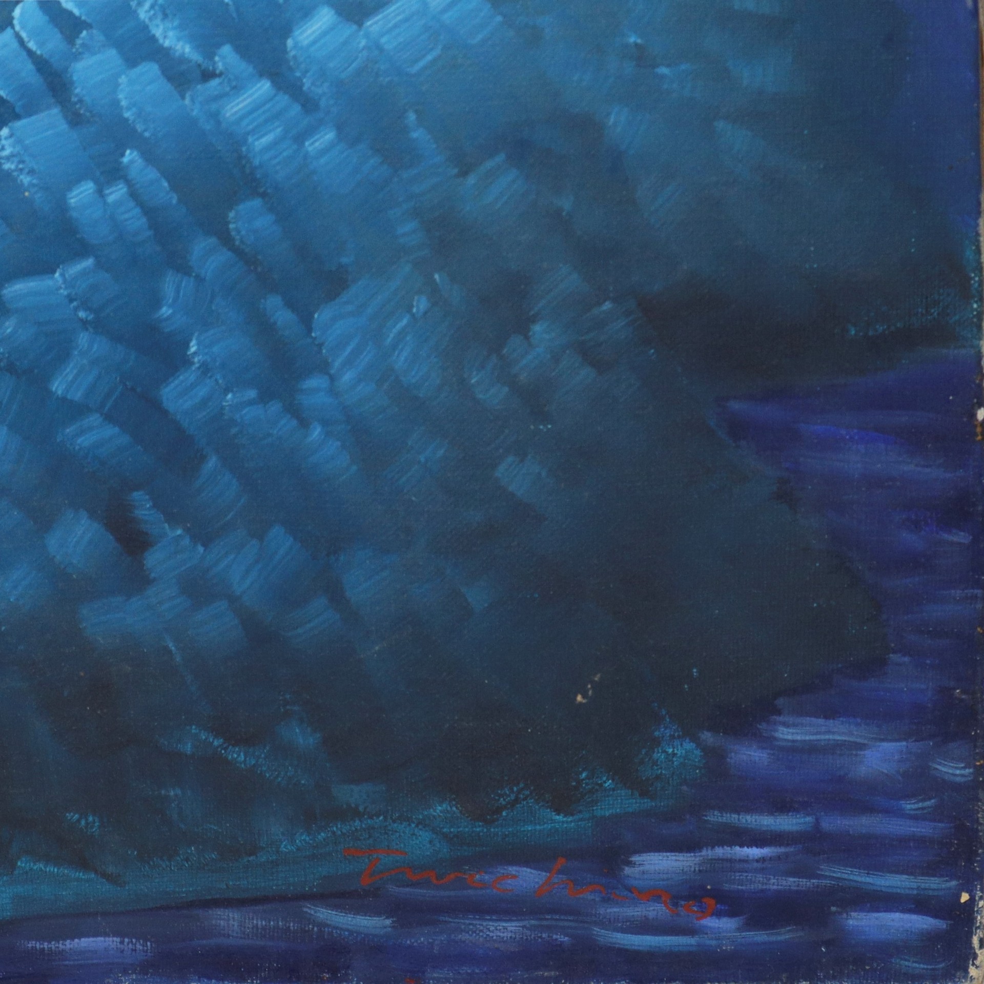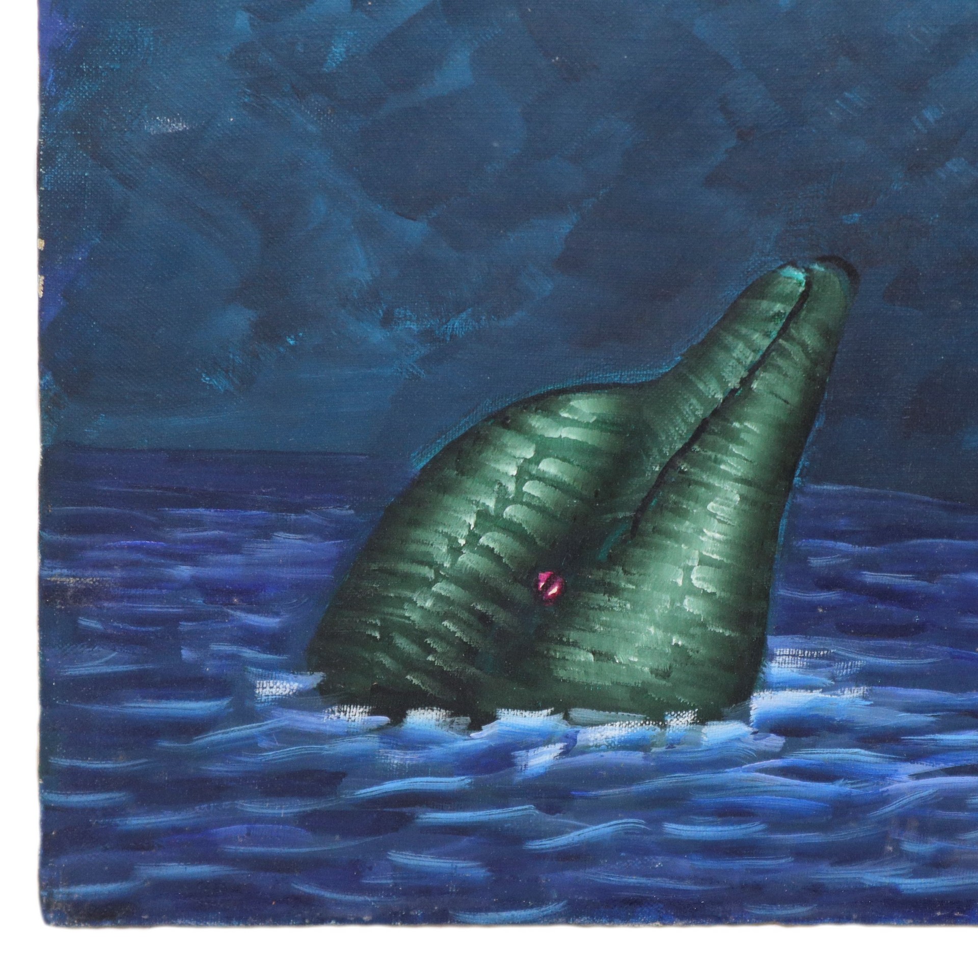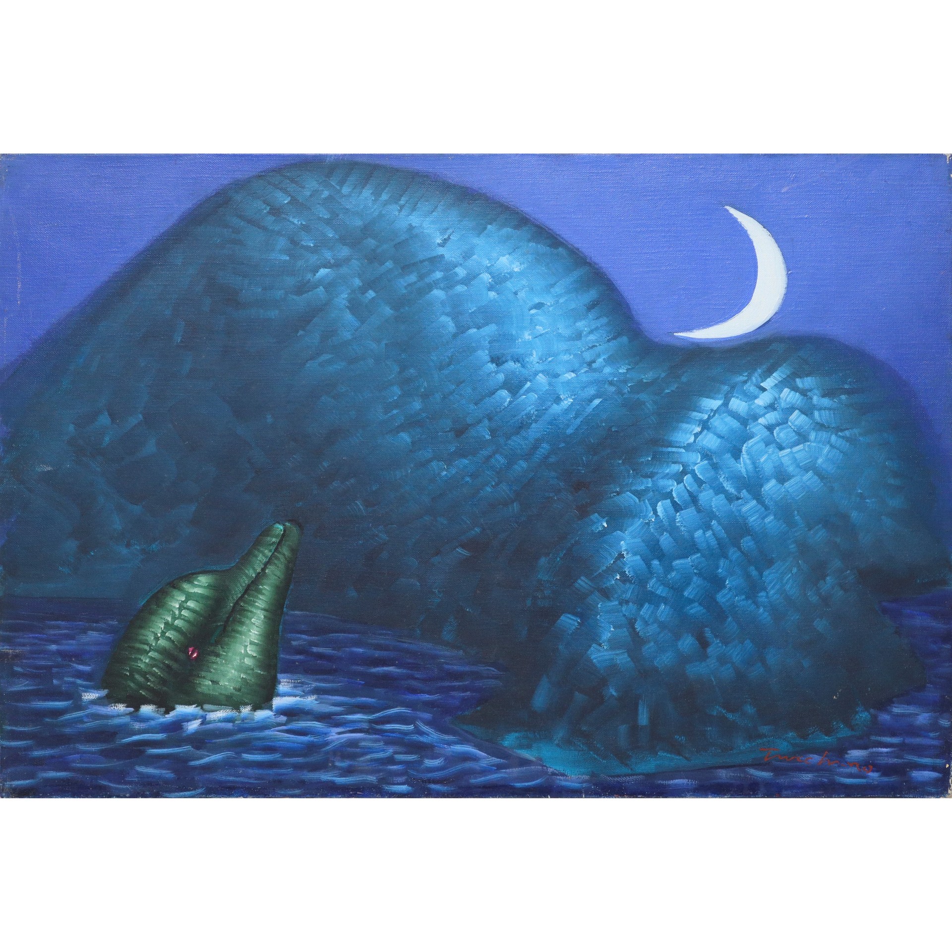 Aldo Turchiaro (Celico 6 aprile 1929) - Delfino al chiaro di luna H cm 35.5x50.5 Olio su tela Firmato al fronte in basso a destra. Firmato al retro. Opera sprovvista di cornice. Autentica su foto del pittore