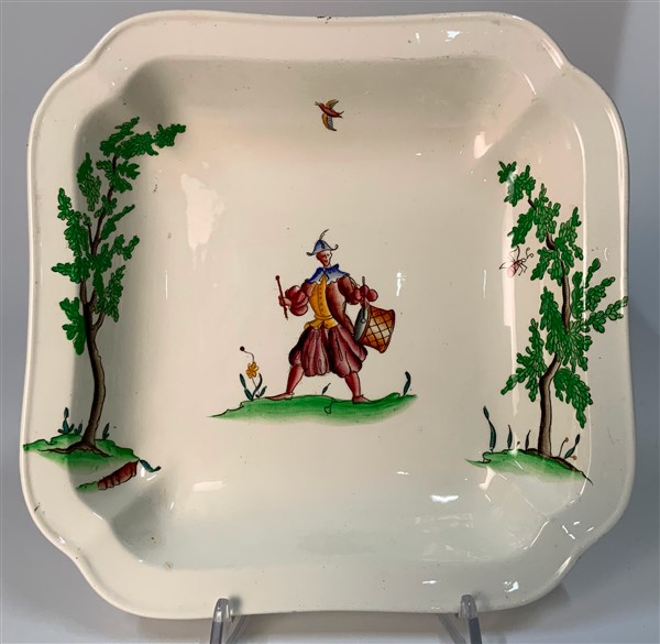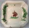 Piatto centrotavola della serie "Vecchio Milano". Esecuzione Società Ceramica Italiana Laveno, Italia, anni '30/'40. Ceramica formata a colaggio decorata con suonatore di tamburo, uccello e alberi in policromia sotto vetrina. Marcato sotto la base con il simbolo grafico della manifattura e della serie. (cm 25x25)