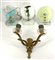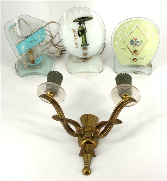 Lotto composto da tre lampade da tavolo con struttura in metallo, base e palumi in vetro decorati a motivi orientali e floreali (cm 11x20x14). Uniti a un'applique a due bracci con struttura in ottone e plexiglass (cm 23x22x15). Italia, anni '50/'60. (difetti e mancanze)