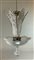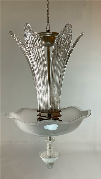 Lampada a sospensione frutto di montage di pezzi diversi in vetro incolore trasparente e acidato, diffusore con profilo polilobato sormontato da foglie. Anni '70/'80. (h cm 96) (difetti e mancanze)