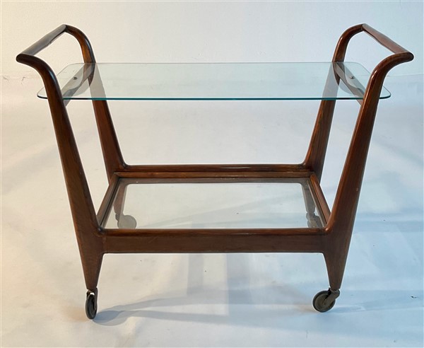 Carrello portavivande in legno massello con due ripiani in vetro. Italia, anni