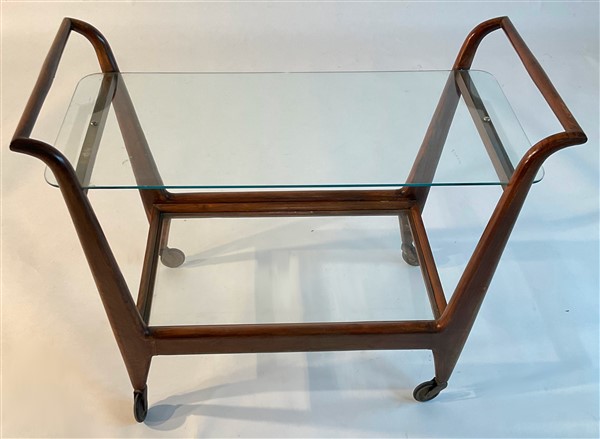 Carrello portavivande in legno massello con due ripiani in vetro. Italia, anni '40/'50. (cm 91x68x46) (lievi difetti)