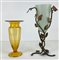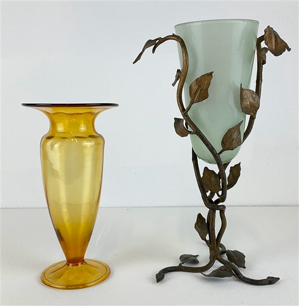 Lotto composto da un vaso a calice in vetro verdino sabbiato internamente, sorretto da racemi fogliati in ferro battuto e verniciato (h cm 33), e un vaso in vetro pagliesco trasparente (h cm 23). Anni '50/'60.
